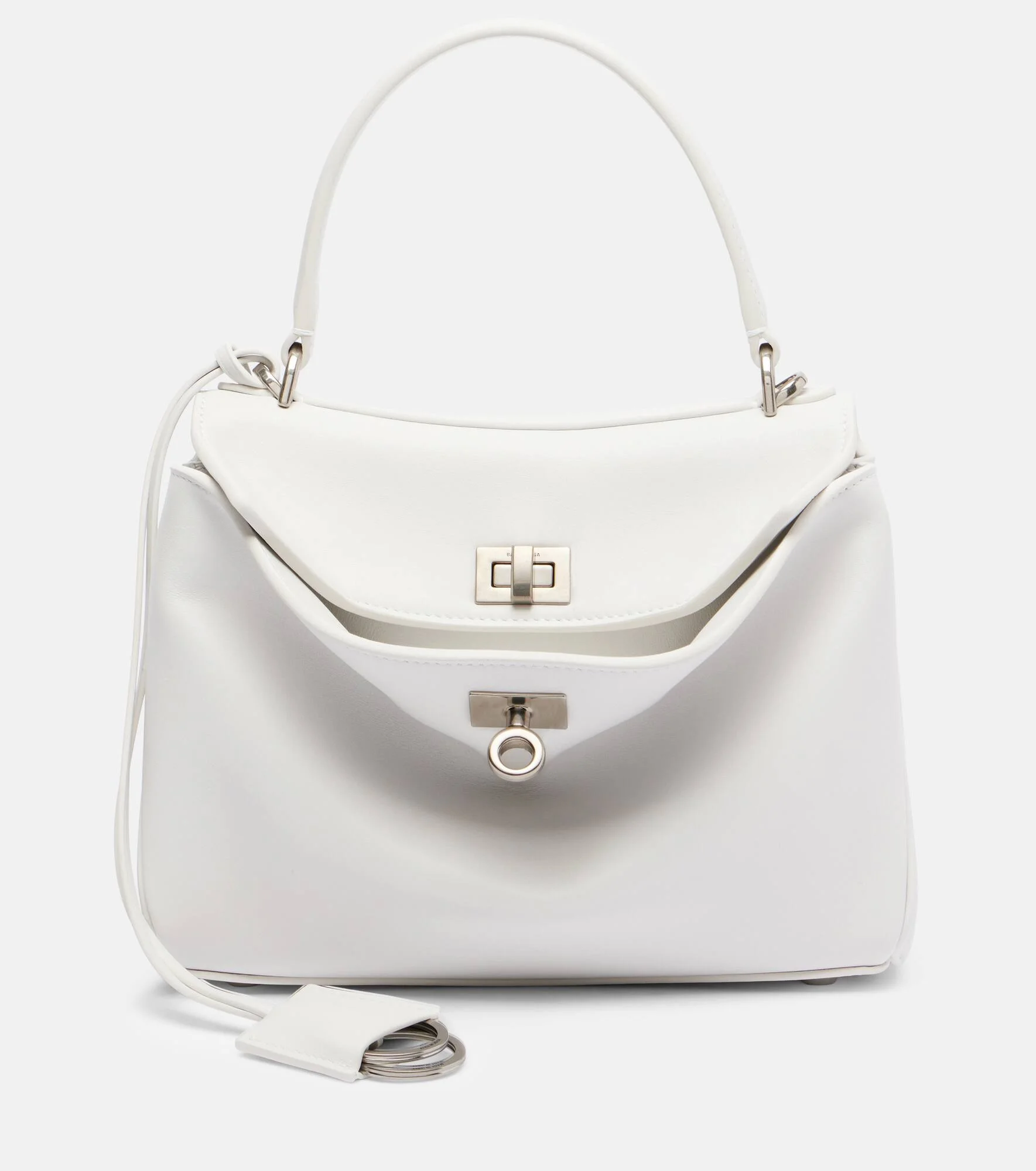 The Rodeo Mini tote bag by Balenciaga is crafted in Italy from leather, offering an edgy yet chic look. This piece features a top handle, detachable shoulder strap, turn-lock fastening, and silver-toned hardware. Product Details - Material: leather - Lining: leather - Made in Italy - Designer color name: Optic White - Item color: white - Hardware color: silver - Closure: turn-lock fastening - Top handle, Detachable, adjustable shoulder strap - Detachable charm - Internal details: two internal compartments, internal slot pocket - Item number: P01117397 Size & Fit - Height 17cm-6.5" - Width 23cm-9" - Depth 8cm-3" - Length of handle 28cm-11" - Adjustable shoulder strap - Min. length shoulder strap 99cm-39" - Max. length shoulder strap 129cm-51"