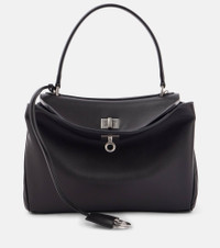 Balenciaga’s Rodeo Small tote bag embodies the brand’s bold Parisian style. Crafted from leather, this bag marries function and flair with a geometric clasp, spacious compartments, and adjustable straps. Product Details - Material: leather - Lining: leather - Made in Italy - Designer color name: Black - Includes: box, dust bag - Closure: push-clasp fastening - Top handle, Detachable, adjustable shoulder strap - Internal details: internal pouch, internal zipped pocket - Hardware color: silver - Item number: P01020757 Size & Fit - Height 19cm-7.5" - Max. width 27cm-10.5" - Depth 9cm-3.5" - Length of handle 37cm-14.5" - Length shoulder strap 116cm-45.5"