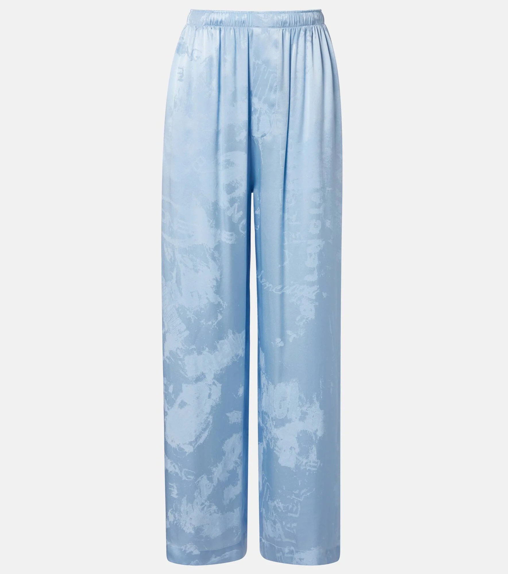 These Balenciaga wide-leg pants are crafted from soft silk, flowing effortlessly with every movement. The elegant silhouette and fluid drape bring a modern sophistication to elevated dressing, making them a versatile choice for both day and evening styling. Product Details - Material: 100% silk - Care instructions: dry clean - Made in Portugal - Color: blue - Designer color name: Baby Blue - Embroidery: 100% polyester - Contains non-textile parts of animal origin - Elasticated drawstring waist - Pockets: side slit pockets - Item number: P01118942 Size & Fit - True to size - Elasticated waist - Non-stretchy fabric - Wide-leg - High-waisted - The model seen in the picture is 178cm-5'10" and wearing a size XS