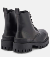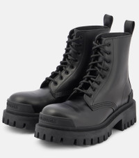 Opt for an attitude-filled addition to your wardrobe with the Strike ankle boots from Balenciaga. The Italian-made design has been crafted from black leather with laced uppers and chunky, lugged rubber soles. Make yours the final touch to winter-ready ensembles. Product Details - Lining: leather - Sole: leather insole, rubber sole - Toe shape: round toe - Upper: calf leather - Closure: lace-up - Designer color name: Black - Comes with a box - Made in Italy - Comes with dust bag - Item number: P00412272 Size & Fit - Fits slightly large to size - we recommend trying a half size smaller - Wide - European sizes - 5cm-2" heel (size EU 38) - 3cm-1" platform (size EU 38)