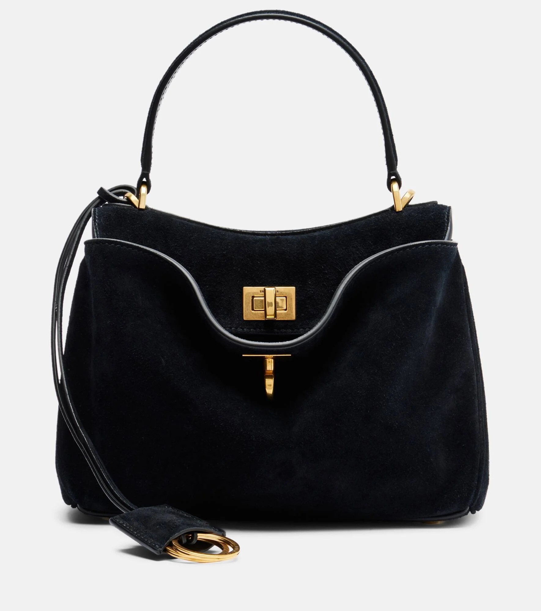 Carry the moment in this tote bag from Balenciaga. The design is crafted in Italy from supple suede and boasts a detachable shoulder strap, secure turn-lock fastening, and a detachable charm. Product Details - Material: calf leather (suede) - Lining: leather - Made in Italy - Color: black - Designer color name: Black - Hardware color: gold - Trim: leather - Top handle, Detachable, adjustable shoulder strap - Internal details: two internal compartments, internal slot pocket - Closure: turn-lock fastening - Protective feet - Includes: dust bag, clochette - Item number: P01164941 Size & Fit - Height 16,5cm-6.5" - Width 23cm-9" - Depth 8cm-3" - Length of handle 28cm-11" - Adjustable shoulder strap - Min. length shoulder strap 98cm-38.5" - Max. length shoulder strap 128cm-50.5"