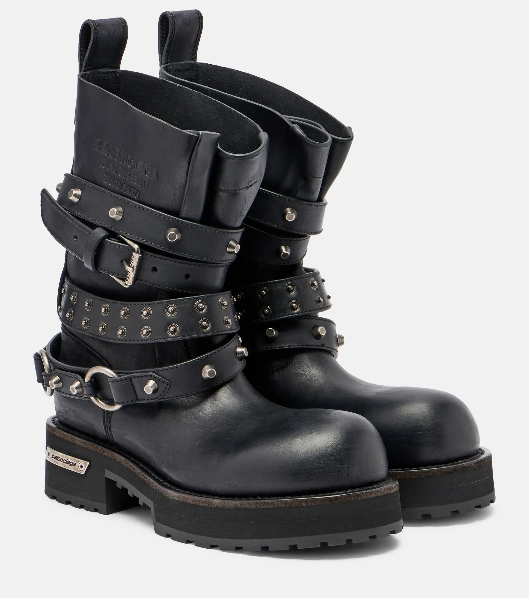 The Venom City biker boots from Balenciaga are crafted in Italy from leather with studded details. The pair features adjustable buckles and logo details on the chunky soles and debossed on the silhouette. Product Details - Upper: calf leather - Lining: leather - Sole: leather insole, rubber sole - Color: black - Toe shape: round toe - Made in Italy - Includes: shoe box, dust bag - Designer color name: Black/Silver - Hardware color: silver - Closure: buckle fastening - Item number: P01126051 Size & Fit - Fits slightly large to size - we recommend trying a half size smaller - European sizes - 5cm-2" heel - 4cm-1.5" platform