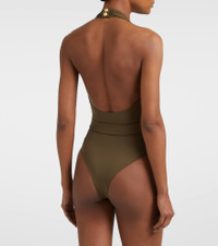 Balmain's sculptural tailoring takes seaside ventures in this swimsuit. Shaped to a deep, V-neckline, this belted style is finished with the house's signature gold-toned monogram hardware at the centre. Product Details - Material: 84% polyester, 16% elastane - Care instructions: hand wash - Made in Italy - Designer color name: Khaki - Item color: green - Closure: snap-buttoned fastenings - Lining: 75% polyamide, 25% elastane - Detachable belt - Item number: P01009699 Size & Fit - True to size - Unpadded Top - High-cut leg - The model seen in the picture is 178cm-5'10", cup size B, and wearing a size FR 36