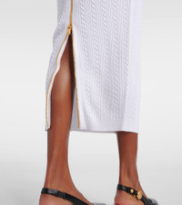 This midi skirt from Balmain shapes the silhouette elegantly. With decorative buttons on the front, this piece features a cable-knit finish and a full zip closure on the back. Product Details - Material: 83% viscose, 17% polyester - Care instructions: specialist clean - Made in France - Designer color name: Blanc - Item color: white - Material II: 83% viscose, 17% polyester - Hardware color: gold - Closure: two-way zipped back - Elasticated waistband - Item number: P01070101 Size & Fit - True to size - Elasticated waist - Stretchy fabric - The model seen in the picture is 178cm-5'10" and wearing a size FR 34