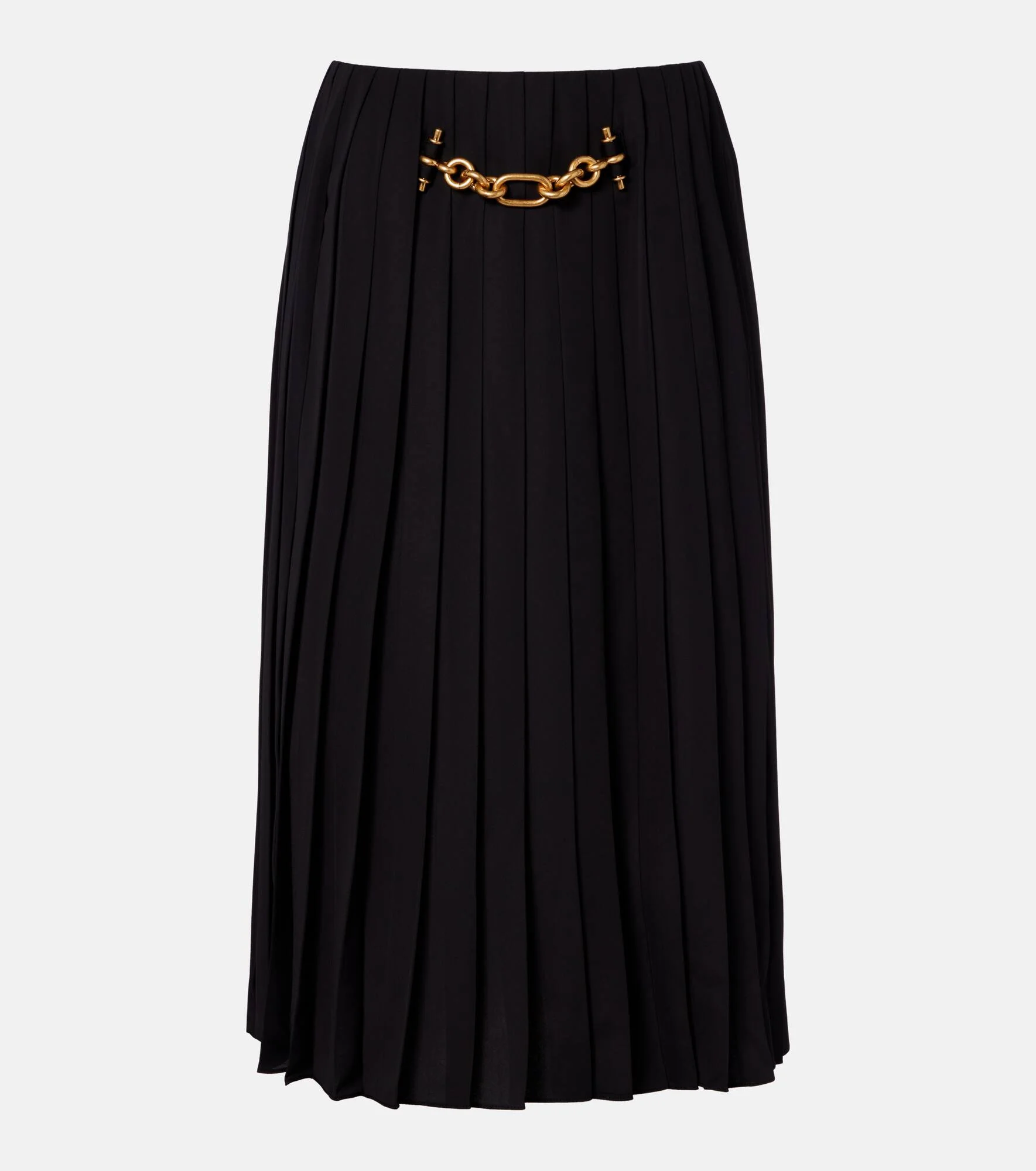 Breathe new life into your wardrobe with Balmain styles that blend the house’s couture heritage with modern aesthetics. This midi skirt showcases an elegant pleated silhouette and is adorned with a gold-tone chain at the waist. Product Details - Material: 100% polyester - Care instructions: dry clean - Made in Portugal - Color: black - Designer color name: Noir - Pocket lining: 52% viscose, 48% cotton - Hardware color: gold - Closure: zip and hook fastening - Item number: P01117307 Size & Fit - True to size - Non-stretchy fabric - The model seen in the picture is 178cm-5'10" and wearing a size FR 34