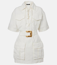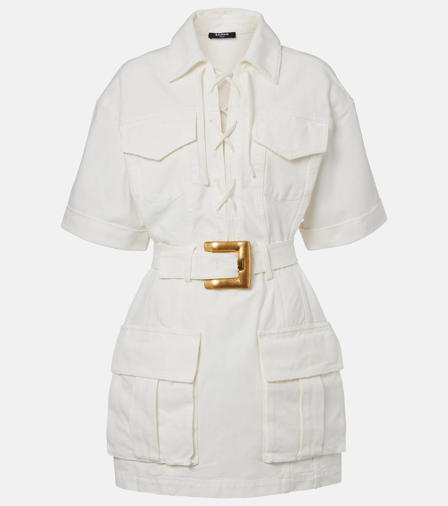 Crafted in Italy from cotton canvas, this Balmain shirt dress highlights the silhouette with its golden detachable belt around the waist. This garment is complete with four pockets and an adjustable lace-up front. Product Details - Material: 100% cotton - Care instructions: specialist clean - Made in Italy - Designer color name: Blanc Casse - Item color: white - Hardware color: gold - Pocket lining: 65% polyester, 35% cotton - Detachable belt - Item number: P01070123 Size & Fit - True to size - Dropped shoulders - Cinched waist - Non-stretchy fabric - The model seen in the picture is 178cm-5'10" and wearing a size FR 34
