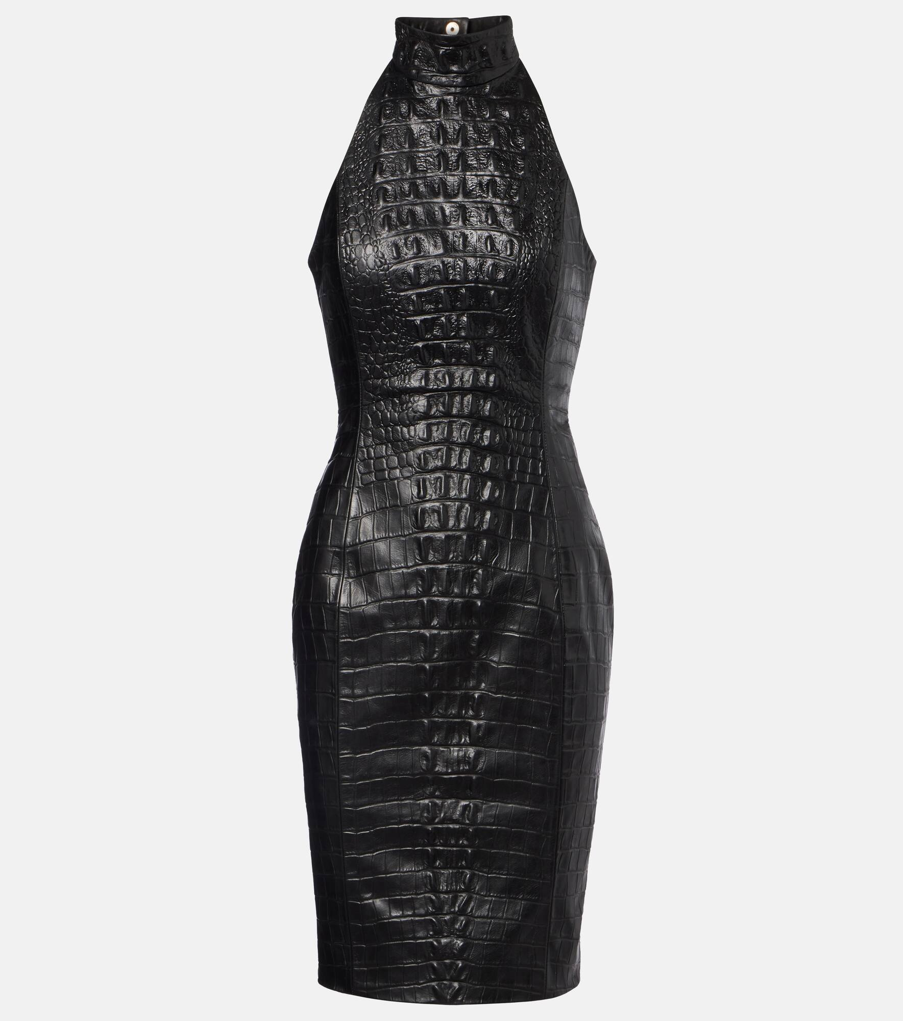 Olivier Rousteing breathes new life into Balmain, respecting the house’s couture heritage with modern relevance. This minidress is crafted from leather with a croc-effect and features a sheath silhouette finished with a halterneck. Product Details - Material: 100% cow leather - Care instructions: specialist clean - Made in Turkey - Designer color name: Black - Item color: black - Material II: 100% lamb leather - Lining: 52% viscose, 48% cotton - Contains non-textile parts of animal origin - Closure: concealed zipped back, button fastening - Item number: P01092827 Size & Fit - Fits small to size - we recommend trying one size larger - Low back - Fitted - Non-stretchy fabric - The model seen in the picture is 178cm-5'10" and wearing a size FR 38