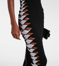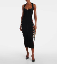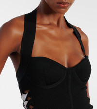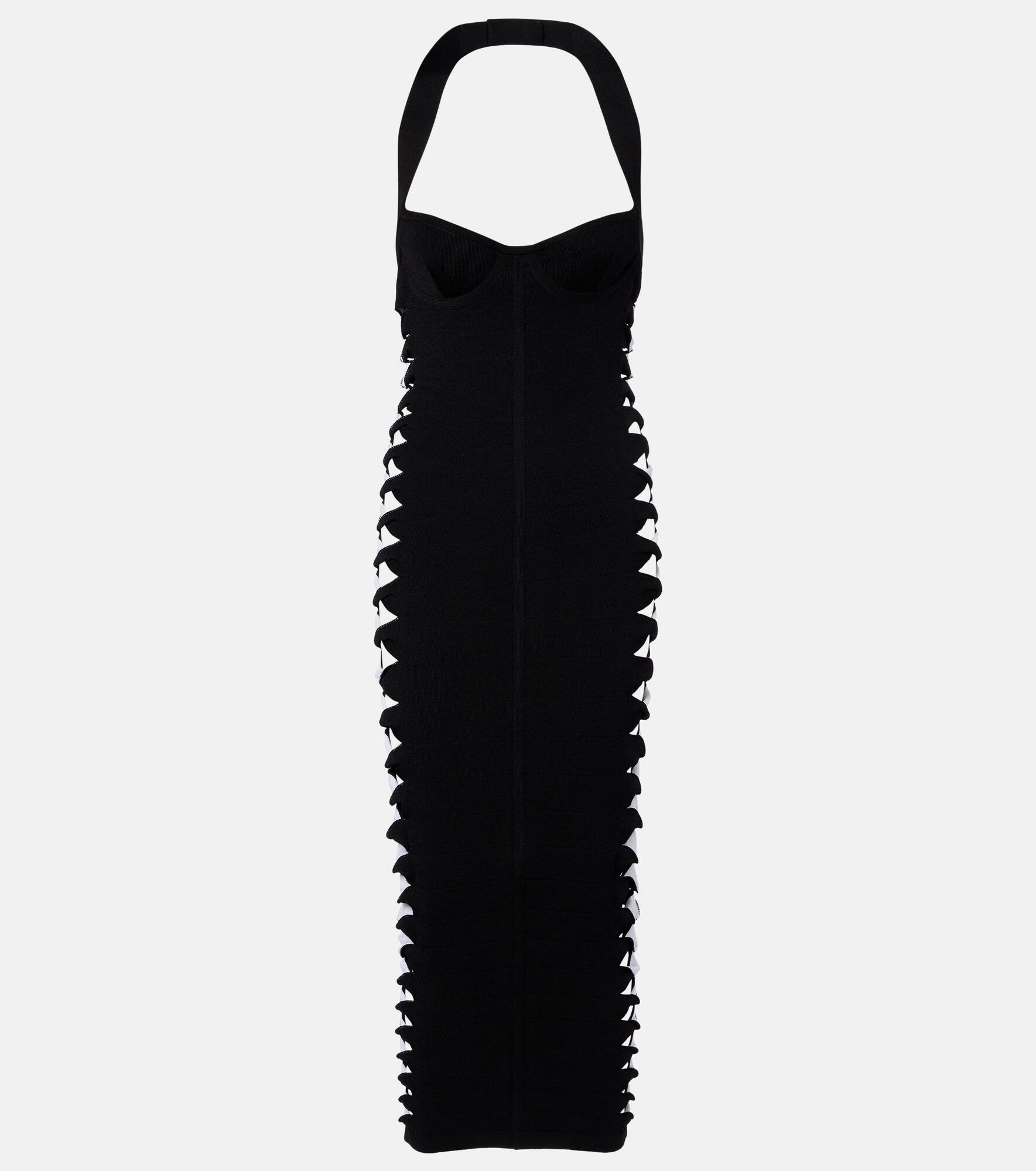 Olivier Rousteing breathes new life into Balmain, respecting the house’s couture heritage with modern relevance. This midi dress is crafted from jersey with cutout details and boasts an alluring halter neckline. Product Details - Material: 86% viscose, 11% polyester, 2% polyamide, 1% elastane - Care instructions: dry clean - Made in France - Designer color name: Noir/Blanc - Item color: black, white - Material II: 84% viscose, 10% polyester, 4% polyamide, 2% elastane - Hardware color: gold - Underwired cups - Removable cup padding - Closure: zipped back, buttoned back - Item number: P01092828 Size & Fit - True to size - Low back - Fitted - Stretchy fabric - Removable padding - The model seen in the picture is 178cm-5'10" and wearing a size FR 34