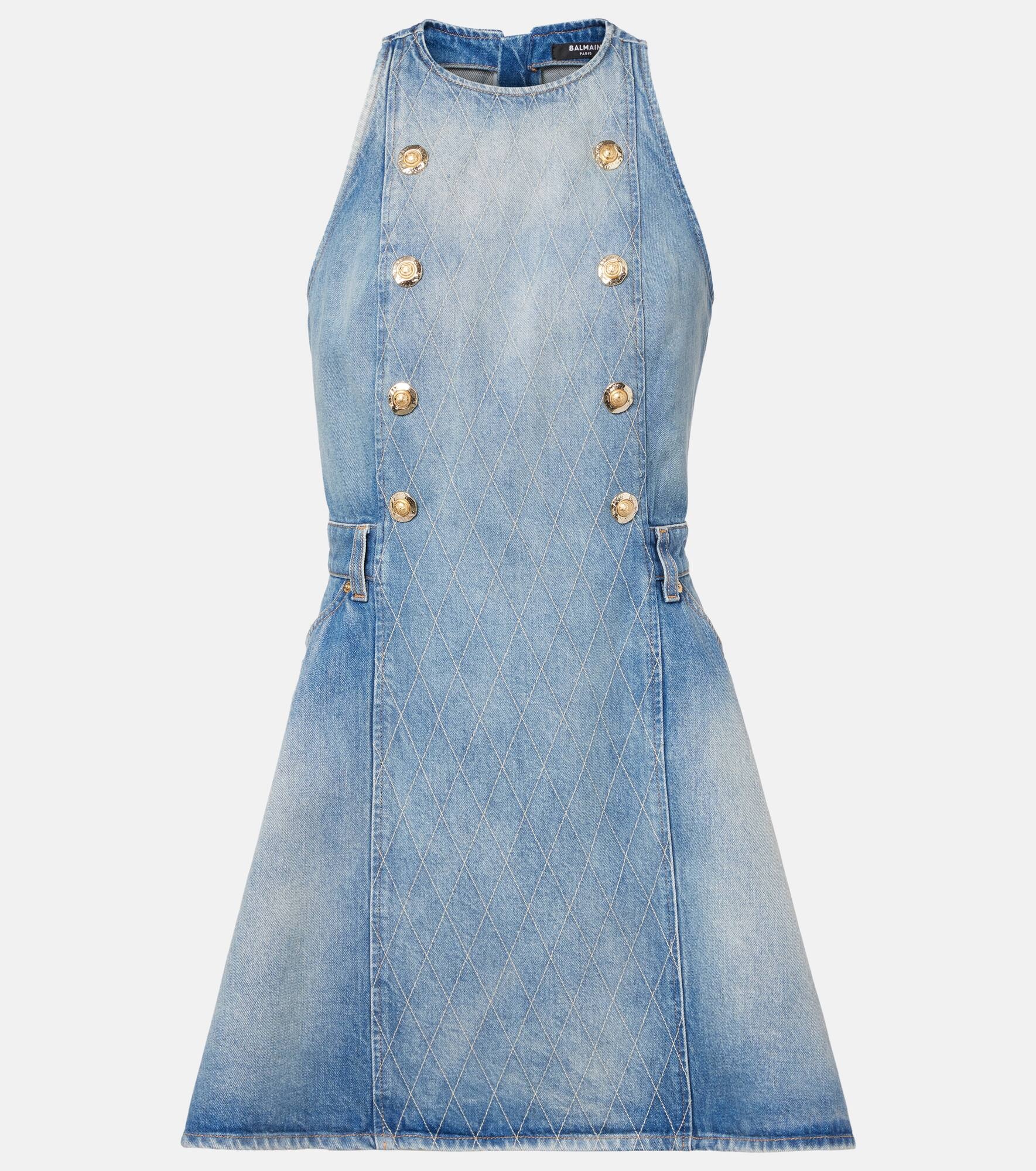 This Balmain sleeveless minidress creates a contemporary, stylish look. Made in Italy from denim, its design features embellishing buttons, a checked seam detail on the front, and two side pockets. Product Details - Material: 100% cotton - Care instructions: specialist clean - Made in Italy - Designer color name: Bleu Jean Clair - Item color: blue - Lining: 65% polyester, 35% cotton - Hardware color: gold - Closure: partially zipped - Partially lined - Item number: P01070115 Size & Fit - True to size - Cinched waist - Non-stretchy fabric - The model seen in the picture is 178cm-5'10" and wearing a size FR 34