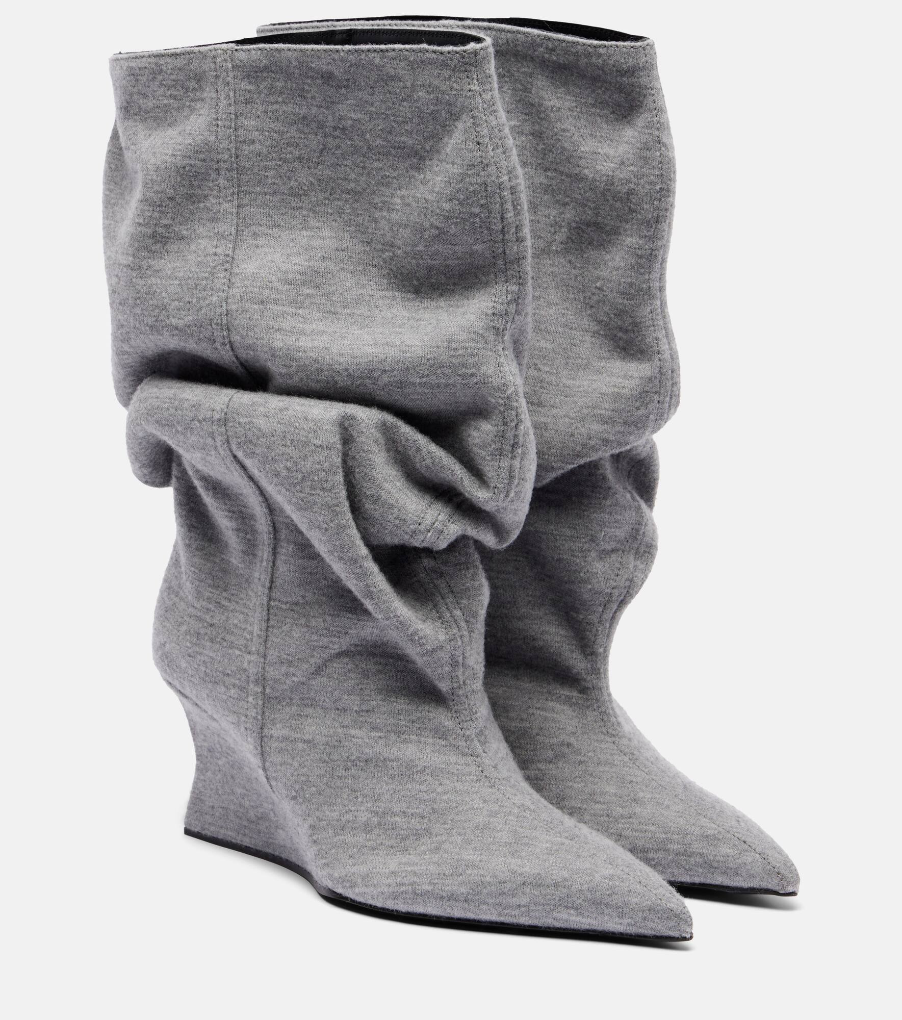 Olivier Rousteing breathes new life into Balmain, respecting the house’s couture heritage with modern relevance. These ankle boots boast natural draping and are set atop curved, wedge soles. Product Details - Upper: wool, cotton - Lining: calf leather - Sole: leather insole and sole - Toe shape: pointed toe - Made in Italy - Includes: dust bag, shoe box - Designer color name: Gris Clair - Item color: gray - Item number: P01101741 Size & Fit - True to size - European sizes - 7cm-3" wedge heel (size EU 38)