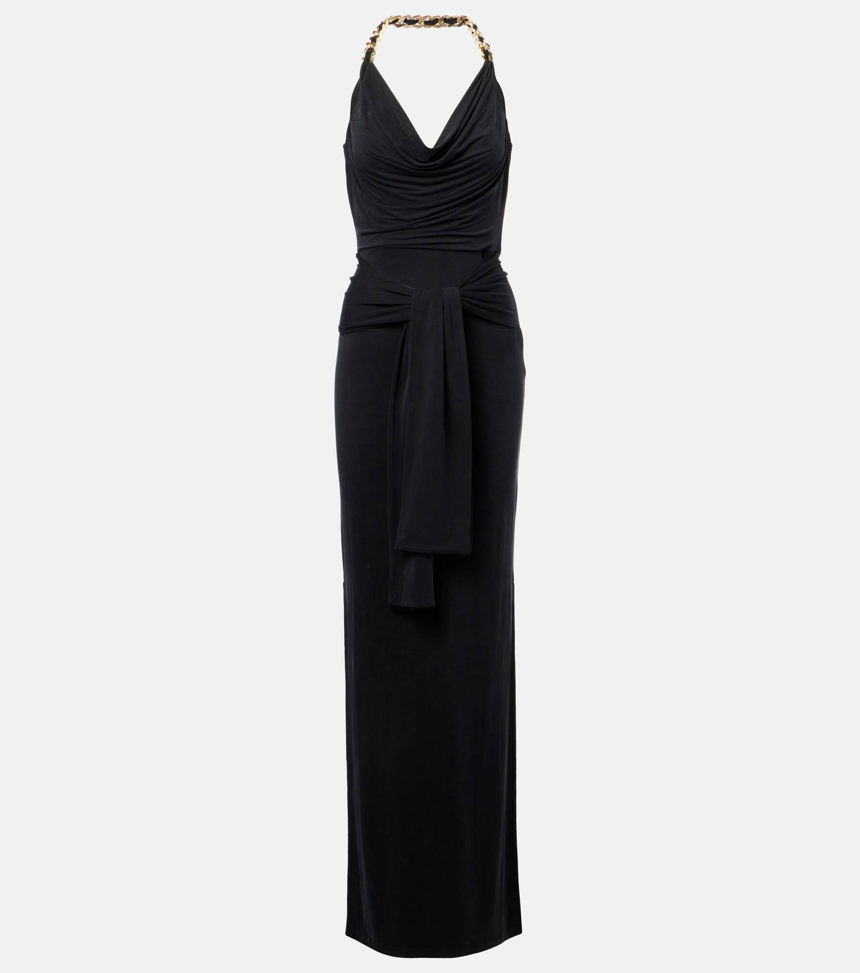 This Balmain gown features a draped bodice with a V-neckline and a sleek, floor-length silhouette. A gold-toned chain halter and gathered waist detail create a luxurious, figure-enhancing look for evening occasions. Product Details - Material: 93% cupro, 7% elastane - Care instructions: dry clean - Made in Portugal - Designer color name: Gris Fonce - Item color: black - Lining: 90% polyester, 10% elastane - Hardware color: gold - Item number: P01084161 Size & Fit - True to size - Low back - Fitted - Stretchy fabric - The model seen in the picture is 178cm-5'10" and wearing a size XS
