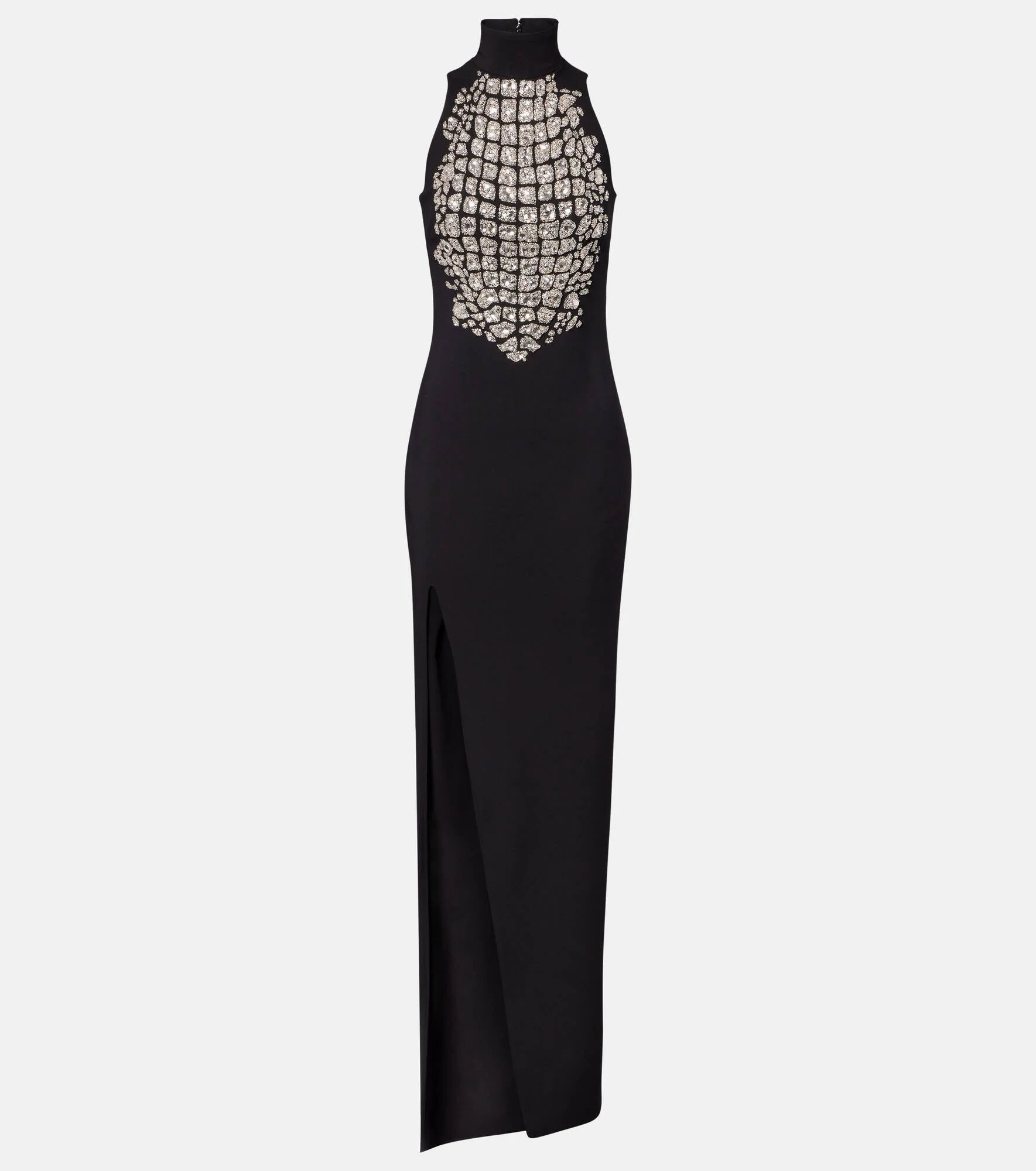Olivier Rousteing breathes new life into Balmain, respecting the house’s couture heritage with modern relevance. This gown is tailored to a sheath silhouette with a deep front slit, a high neckline, and dazzling embellishments for a glamorous touch. Product Details - Material: 75% viscose, 17% polyamide, 8% elastane - Care instructions: dry clean - Made in India - Designer color name: Noir/Crystal - Item color: black - Insert: 80% glass, 20% polyester - Lining: 96% silk, 4% elastane - Collar: turtleneck - Closure: concealed zipped back - Long vent - Item number: P01092830 Size & Fit - True to size - Fitted - Slightly stretchy fabric - slit length 88cm-34.5" - Height of model is 180cm-71" and wears a size FR 34