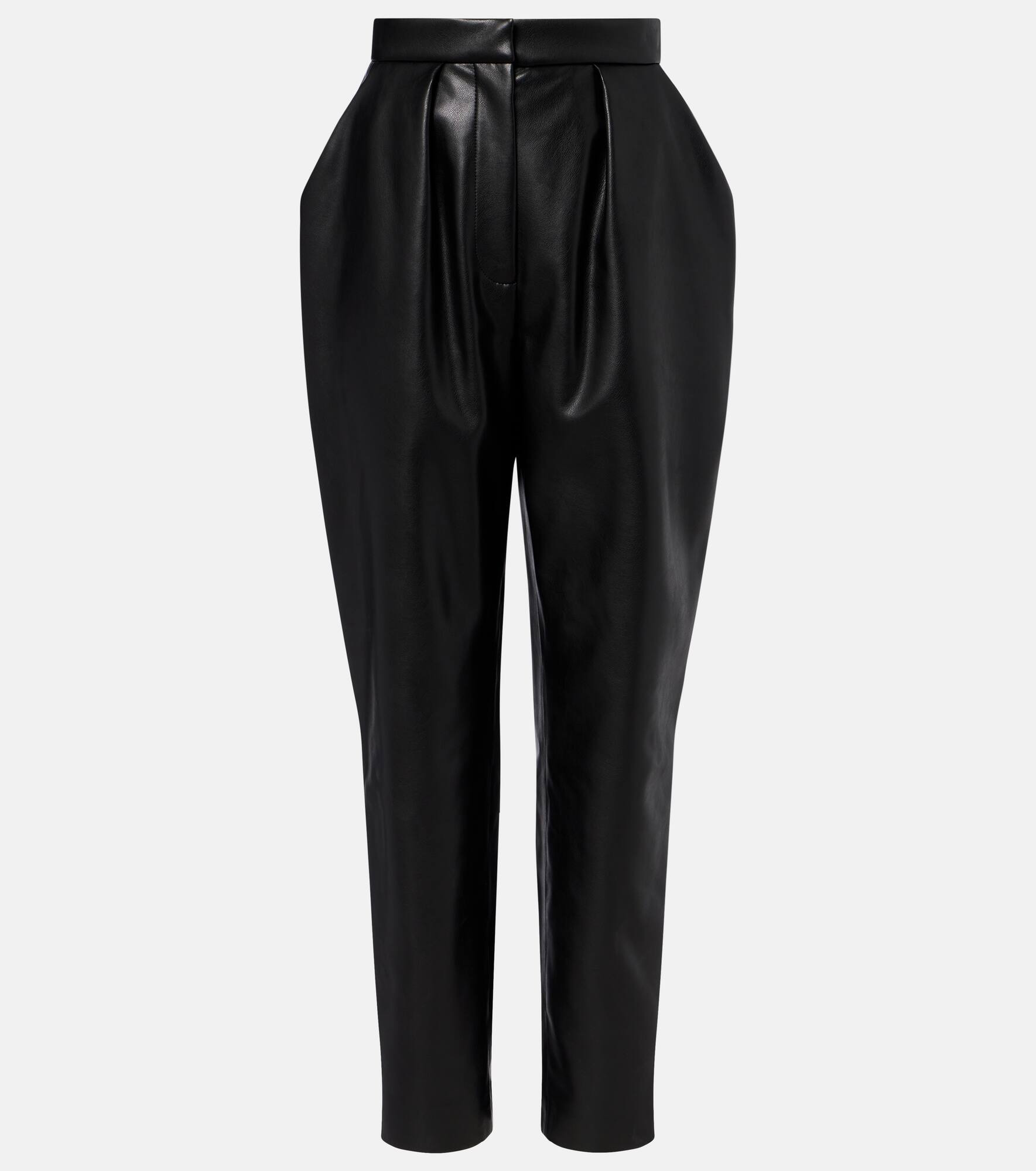 Balmain's tapered pants are crafted from faux leather with a single pleat and slant pockets. The tailored silhouette is finished with a zip, hook, and button fastening for a clean, structured fit. Product Details - Material: 100% viscose - Care instructions: dry clean - Made in Bulgaria - Designer color name: Noir - Item color: black - Material II: 100% polyurethane - Lining: 52% viscose, 48% cotton - Pocket lining: 52% viscose, 48% cotton - Closure: zip, hook, and button fastening - Pockets: slant pockets - Single pleat - Item number: P01070105 Size & Fit - True to size - Non-stretchy fabric - Tapered leg - High-waisted - The model seen in the picture is 178cm-5'10" and wearing a size FR 34
