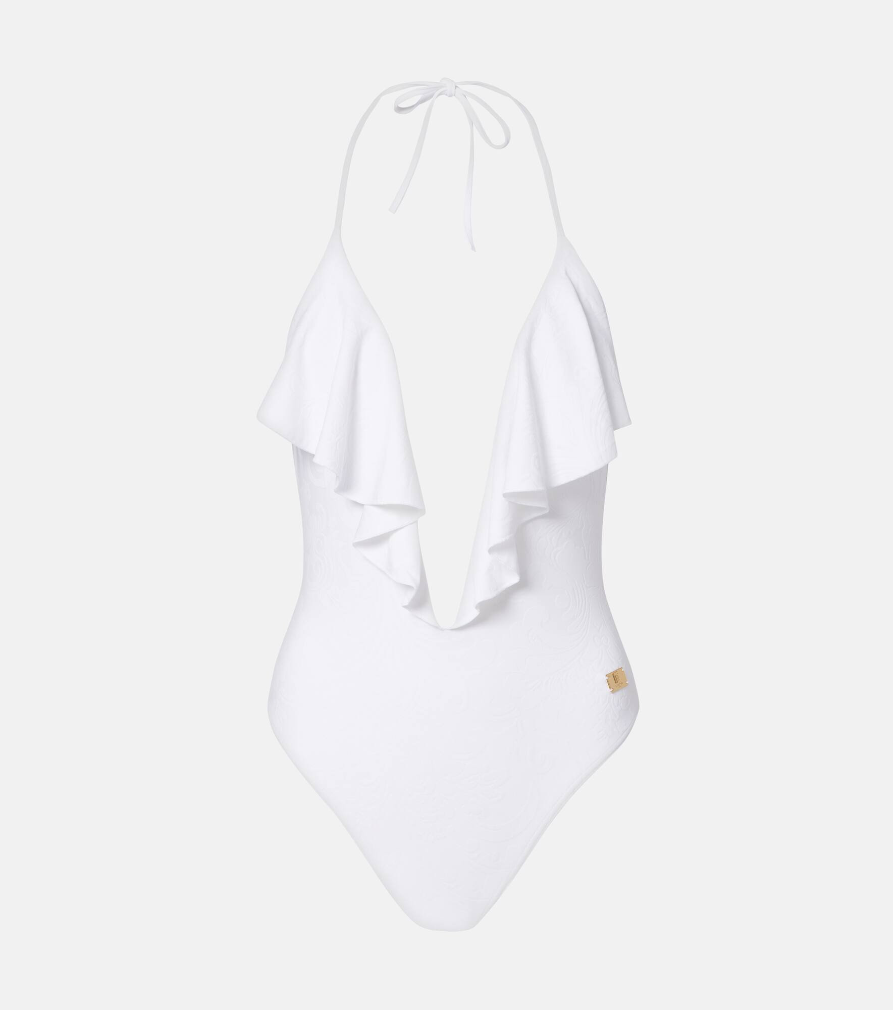 Elevate your swimwear edit with this Balmain swimsuit, an ideal staple for beach or poolside lounging. This one-piece features a charming frilled V--neckline and a self-tie closure at the neck. Product Details - Material: 82% polyamide, 18% elastane - Care instructions: hand wash - Made in Italy - Designer color name: White - Item color: white - Lining: 75% polyamide, 25% elastane - Closure: self-ties - Includes: dust bag - Item number: P01066097 Size & Fit - True to size - Please note: small cups - Minimal coverage - High-cut leg - The model seen in the picture is 178cm-5'10", cup size B, and wearing a size FR 34