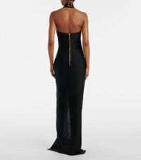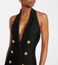 Make a statement with this halterneck Balmain blazer dress featuring an alluring open back and decorative gold-toned coin buttons. This sophisticated piece is designed with a plunging V-neckline, a lapel collar, and a front slit for added allure. Product Details - Material: 98% viscose, 2% elastane - Care instructions: dry clean - Made in France - Designer color name: Noir - Item color: black - Closure: zipper, snap-button fastenings - Item number: P01070129 Size & Fit - True to size - Low back - Fitted - Stretchy fabric - The model seen in the picture is 178cm-5'10" and wearing a size FR 34
