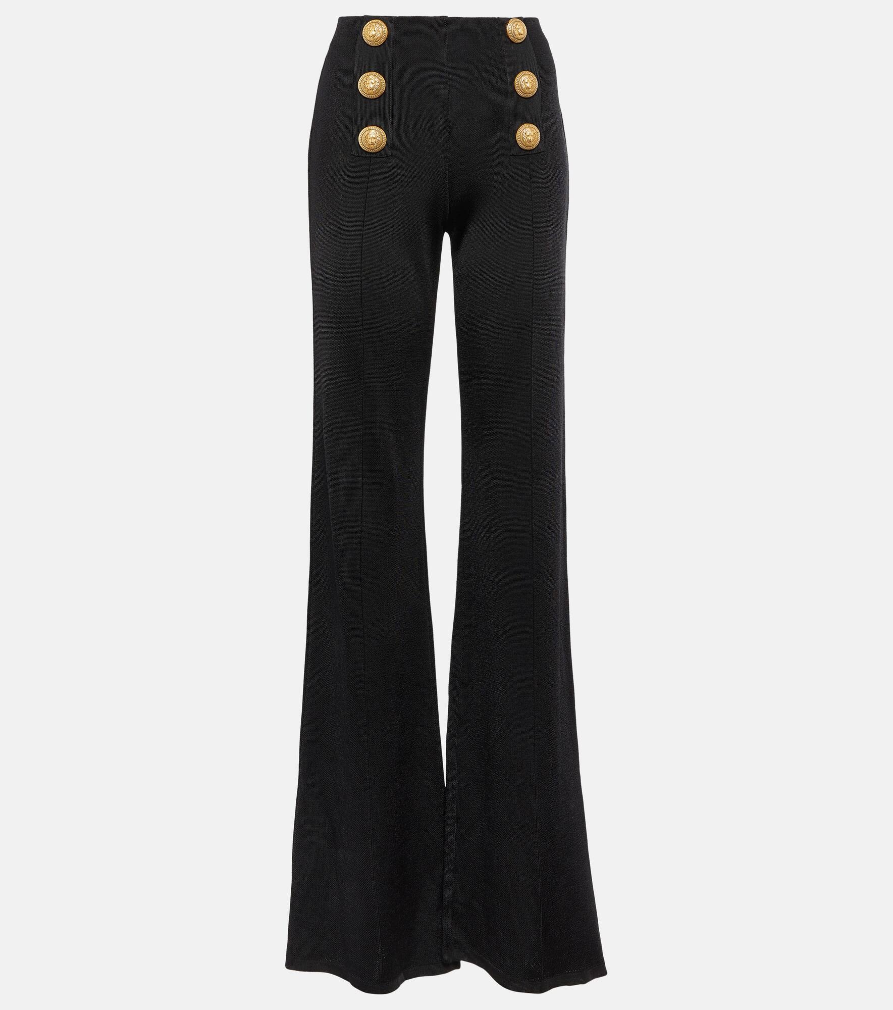 Olivier Rousteing breathes new life into Balmain, respecting the house’s couture heritage with modern relevance. Decorated with brand-signature, gold-toned buttons, these pants are knit into a stylish high-rise, flared-leg silhouette. Product Details - Made in France - Material: 100% viscose - Closure: zipped back - Designer color name: 0pa Noir - Care instructions: dry clean - Item number: P00821631 Size & Fit - True to size - Mid-weight material - Stretchy fabric - Slim-leg with a flared hem - The model seen in the picture is 178cm-5'10" and wearing a size FR 36