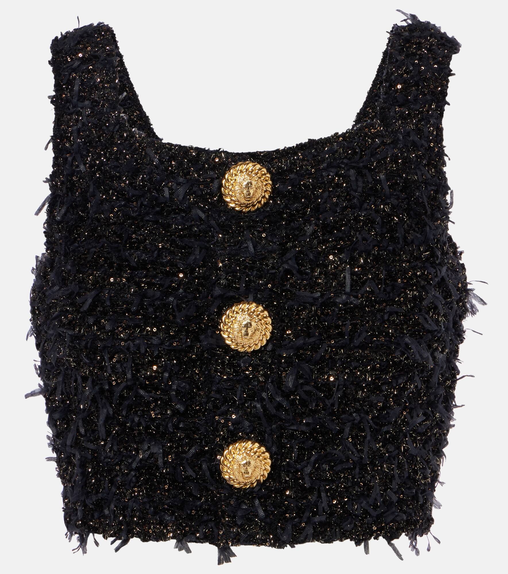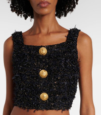 Cropped button-embellished sequined metallic bouclé-tweed top Black