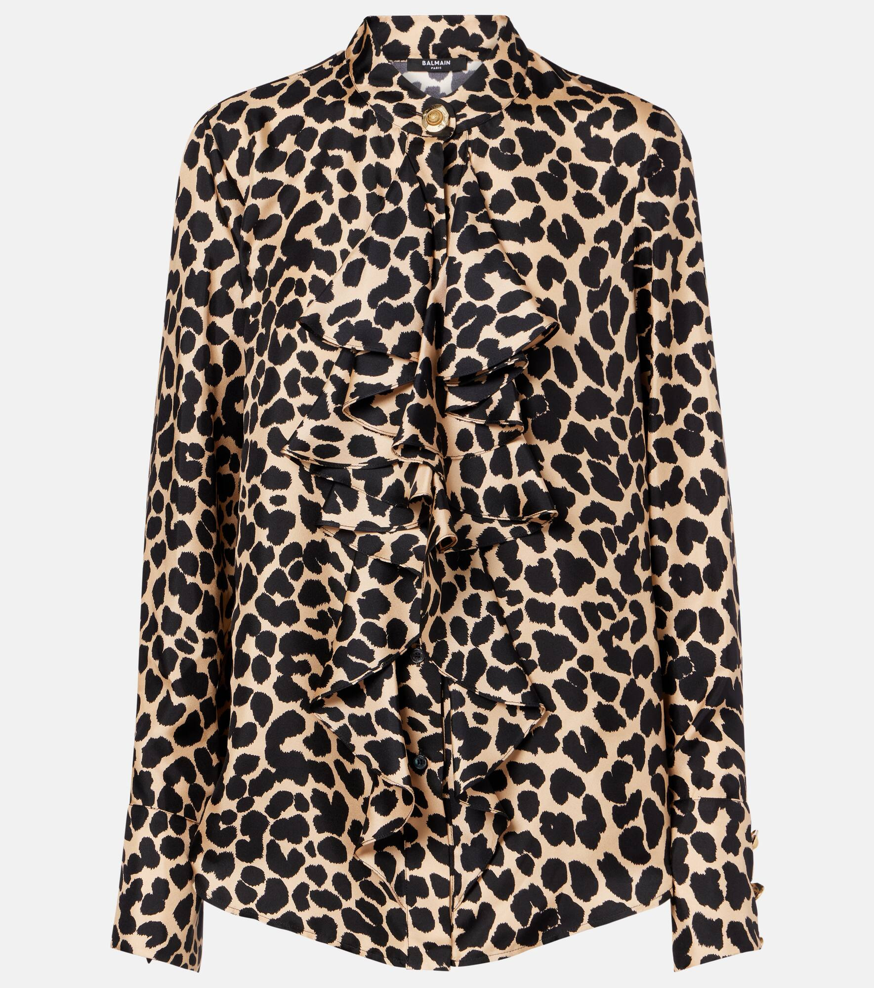 You won’t go unnoticed with this Balmain shirt with a bold all-over leopard print. Crafted from airy silk, this design features a ruffled detail at the front and buttoned cuffs. Product Details - Material: 100% silk - Care instructions: dry clean - Made in Italy - Designer color name: Beige/Noir - Item color: beige - Contains non-textile parts of animal origin - Closure: buttoned front - Cuff: buttoned - Item number: P01069929 Size & Fit - True to size - Designed for a loose fit - Non-stretchy fabric - Falls below the hip - The model seen in the picture is 178cm-5'10" and wearing a size FR 34