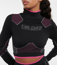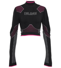 This sporty crop top from Balmain has long sleeves and logo detailing. Product Details - Care instructions: machine wash at 40 degrees - Made in Italy - Material: 90% polyamide, 10% elastane - Designer color name: Noir/Fuchsia - Item number: P00743216 Size & Fit - Fits large to size - we recommend trying one size smaller - Straight fit - Mid-weight material - Stretchy fabric - Cropped - The model seen in the picture is 178cm-5'10" and wearing a size 1