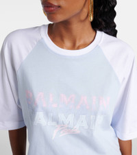 Made from pure cotton, this Balmain jersey T-shirt brings comfort to your everyday looks thanks to its relaxed fit. Its design showcases the brand's logo on the front, and the cropped silhouette is a stylish shape. Product Details - Material: 100% cotton - Care instructions: machine wash at 30 degrees - Made in Portugal - Designer color name: Bleu Ciel/Blanc/Multicolore - Item color: white, blue - Material II: 98% cotton, 2% elastane - Sleeves: raglan - Item number: P01069927 Size & Fit - True to size - Designed for a loose fit - Slightly stretchy fabric - Slightly cropped - The model seen in the picture is 178cm-5'10" and wearing a size XS