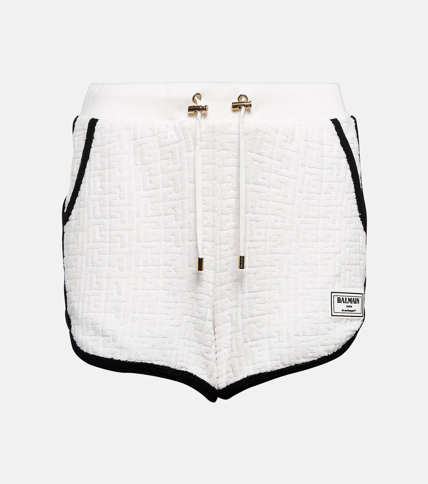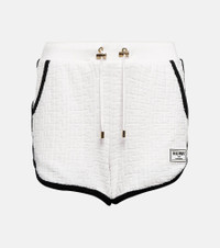 These shorts from Balmain is made from a cotton-blend and features a subtle and spongy pattern of the brand's iconic monogram. The design comes with black trims around the pockets and the hem. Product Details - Lining: 100% cotton - Material: 78% cotton, 22% polyamide - Material II: 100% cotton - Designer color name: Blanc/Noir - Care instructions: machine wash at 30 degrees - Made in Portugal - Elasticated drawstring waist - Pockets: side slit pockets, back pockets - Item number: P00819510 Size & Fit - True to size - Elasticated waist - Adjustable at the waist - Mid-weight material - Wide-leg - The model seen in the picture is 178cm-5'10" and wearing a size FR 36