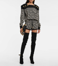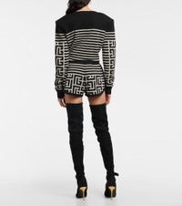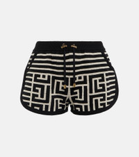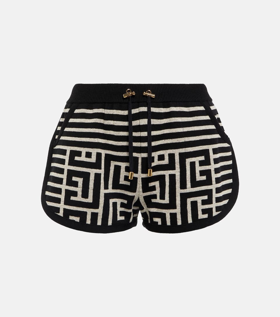 These shorts from Balmain are knit from a wool and linen-blend in a straight-leg silhouette with side slit pockets. It features an elasticated waist and drawstring ties and showcases the house monogram. Product Details - Material: 55% wool, 40% linen, 5% polyamide - Made in France - Pockets: side slit pockets - Designer color name: Noir/Ivoire - Drawstring waist - Care instructions: dry clean - Trim: 100% wool (merino wool) - Item number: P00766342 Size & Fit - True to size - Elasticated waist - Adjustable at the waist - Mid-weight material - Straight leg - The model seen in the picture is 178cm-5'10" and wearing a size FR 36