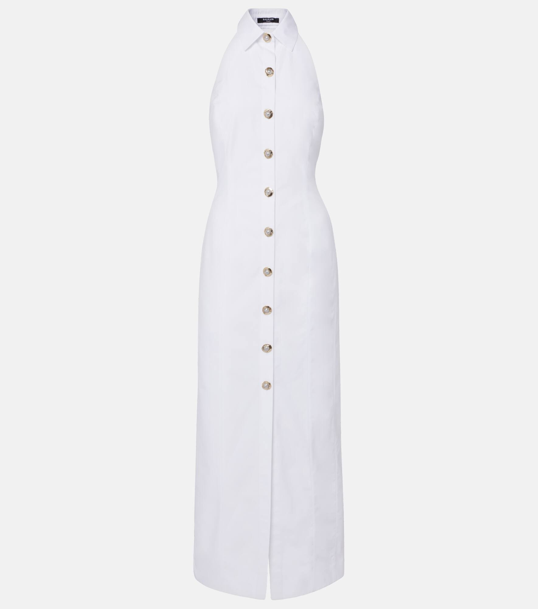Crafted in Italy from cotton poplin, this shirt dress blends Balmain’s couture heritage with modern sophistication. This sleeveless style features an alluring open back, a shirt collar, and a front closure with “Gold and Silver Coin” metal buttons. Product Details - Material: 100% cotton - Care instructions: specialist clean - Made in Italy - Designer color name: Blanc - Item color: white - Lining: 100% cotton - Closure: buttoned front - Collar: classic (Straight point) - Item number: P01070134 Size & Fit - True to size - Low back - Cinched waist - Non-stretchy fabric - The model seen in the picture is 178cm-5'10" and wearing a size FR 34