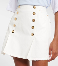 Made from cotton canvas, this Balmain high-rise miniskirt is a sophisticated piece thanks to the decorative golden buttons on the front. Its pleated design is finished with raw hems, five pockets, and a zipped closure on the back. Product Details - Material: 100% cotton - Care instructions: specialist clean - Made in Romania - Designer color name: Blanc Casse - Item color: white - Hardware color: gold - Pocket lining: 65% polyester, 35% cotton - Closure: zipped back - Item number: P01069950 Size & Fit - True to size - Non-stretchy fabric - High-waisted - The model seen in the picture is 178cm-5'10" and wearing a size FR 34
