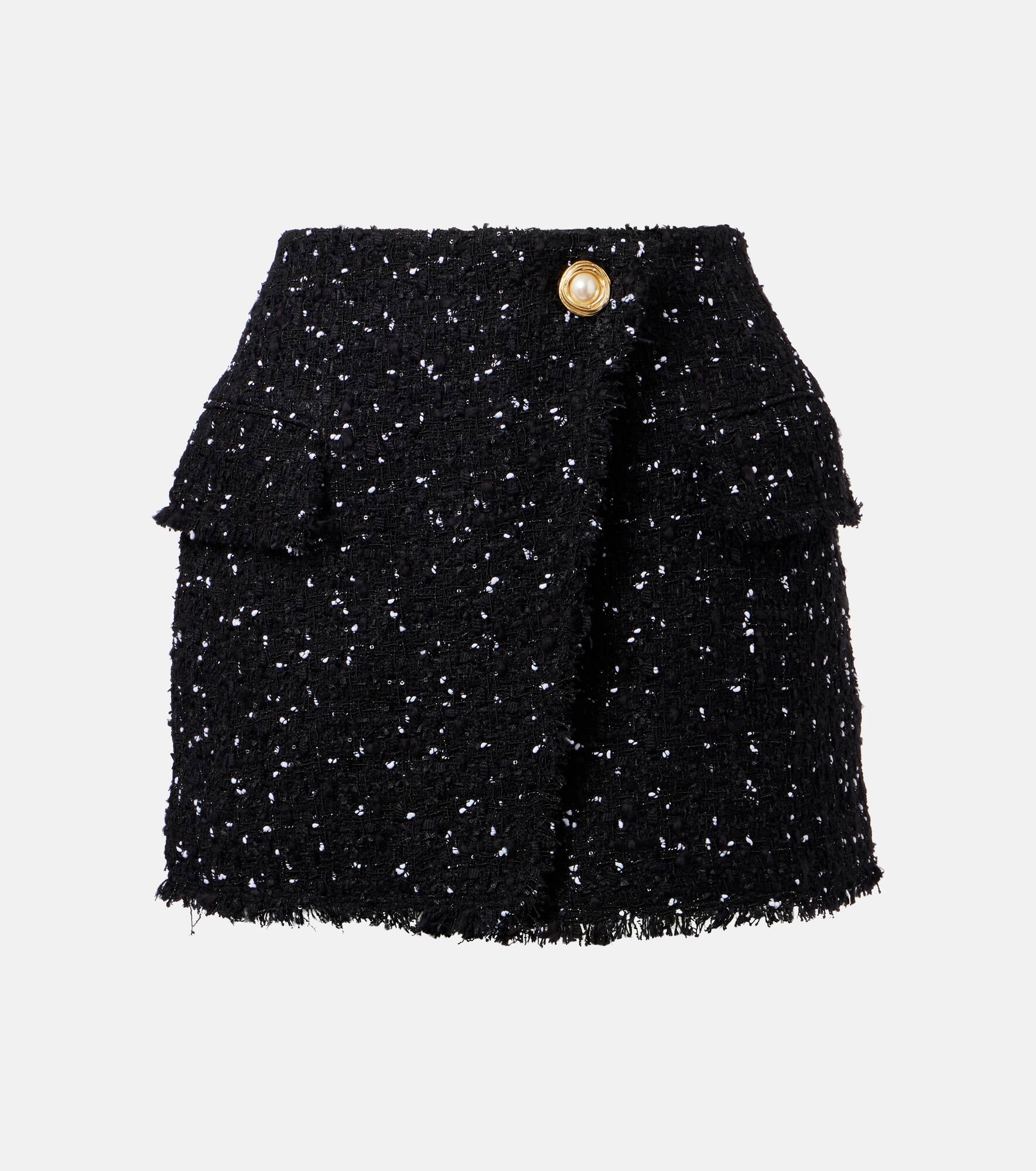 Wrap-effect sequin-embellished frayed tweed mini skirt Black