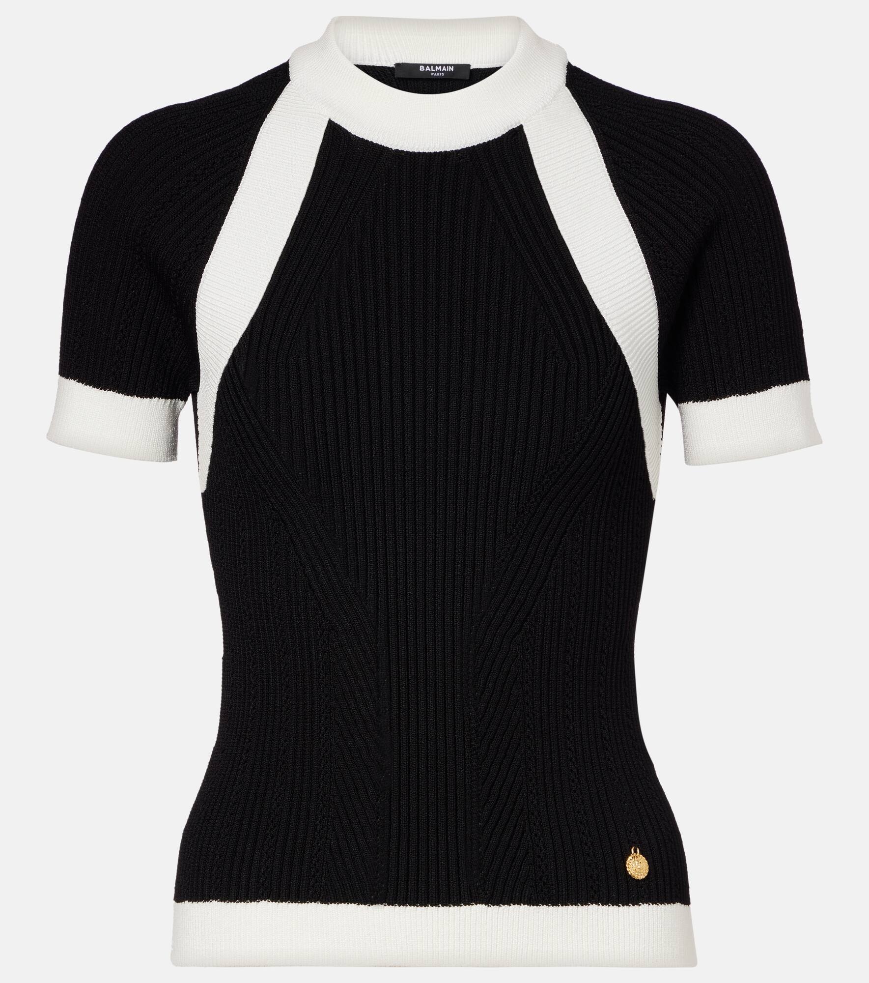Crafted in Italy, this short-sleeved top from Balmain is shaped with a ribbed-knit finish and features openwork details. Its design is complete with a Double Chain Lion embellishment on the front that adds a shiny touch. Product Details - Material: 84% viscose, 16% polyester - Care instructions: specialist clean - Made in Italy - Designer color name: Noir/Blanc - Item color: black, white - Material II: 84% viscose, 16% polyester - Hardware color: gold - Sleeves: raglan - Item number: P01069925 Size & Fit - True to size - Fitted - Stretchy fabric - Falls to the hip - The model seen in the picture is 178cm-5'10" and wearing a size FR 34