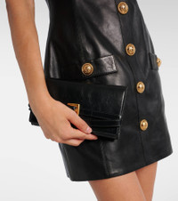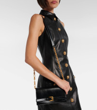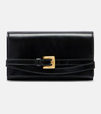 Olivier Rousteing breathes new life into Balmain, respecting the house’s couture heritage with modern relevance. The Shuffle Micro wallet on chain is crafted from leather and offers hand, shoulder, or crossbody styling. Product Details - Material: calf leather - Lining: lamb leather - Made in Italy - Designer color name: Opa Noir - Item color: black - Hardware color: gold - Closure: snap-buttoned fastening - Chain and leather shoulder strap - Internal details: single compartment, card slot - Item number: P01039102 Size & Fit - Height 12cm-4.5" - Width 21cm-8.5" - Depth 2,5cm-1" - Length shoulder strap 115cm-45.5"