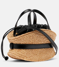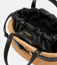 The Shuffle Mini tote bag by Balmain is crafted in Italy from raffia with a leather trim. This sophisticated accessory features a gold-toned belt, removable shoulder straps, top handles, and the brand's logo at the front. Product Details - Material: raffia, calf leather, polyurethane, polyester, lamb leather - Lining: polyurethane, fabric - Made in Italy - Designer color name: Gwn Naturel / Noir - Item color: beige - Detachable shoulder strap, Top handles - Hardware color: gold - Includes: dust bag - Item number: P01039096 Size & Fit - Height 17cm-6.5" - Width 25cm-10" - Depth 11cm-4.5" - Adjustable shoulder strap - Max. length shoulder strap 104cm-41"