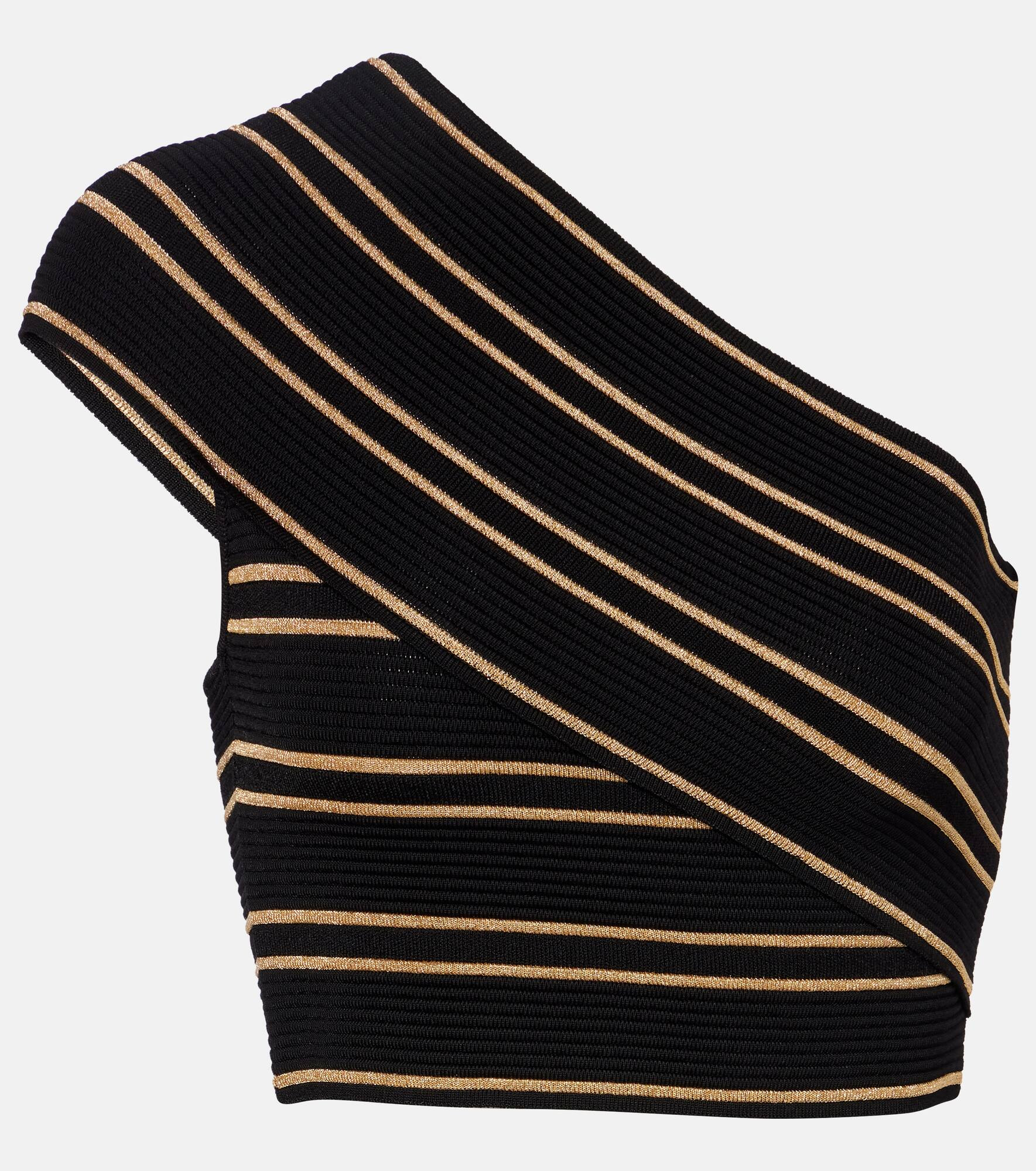This crop top from Balmain flaunts a flattering silhouette that gently wraps around the chest for a stylish look. This piece is shaped with a one-shoulder neckline and comes with a striped pattern. Product Details - Material: 80% viscose, 12% polyester, 7% polyamide, 1% elastane - Care instructions: specialist clean - Made in France - Designer color name: Noir/Or - Item color: black, gold - Closure: zipped side - Item number: P01069921 Size & Fit - True to size - Fitted - Stretchy fabric - Cropped - The model seen in the picture is 178cm-5'10" and wearing a size FR 34