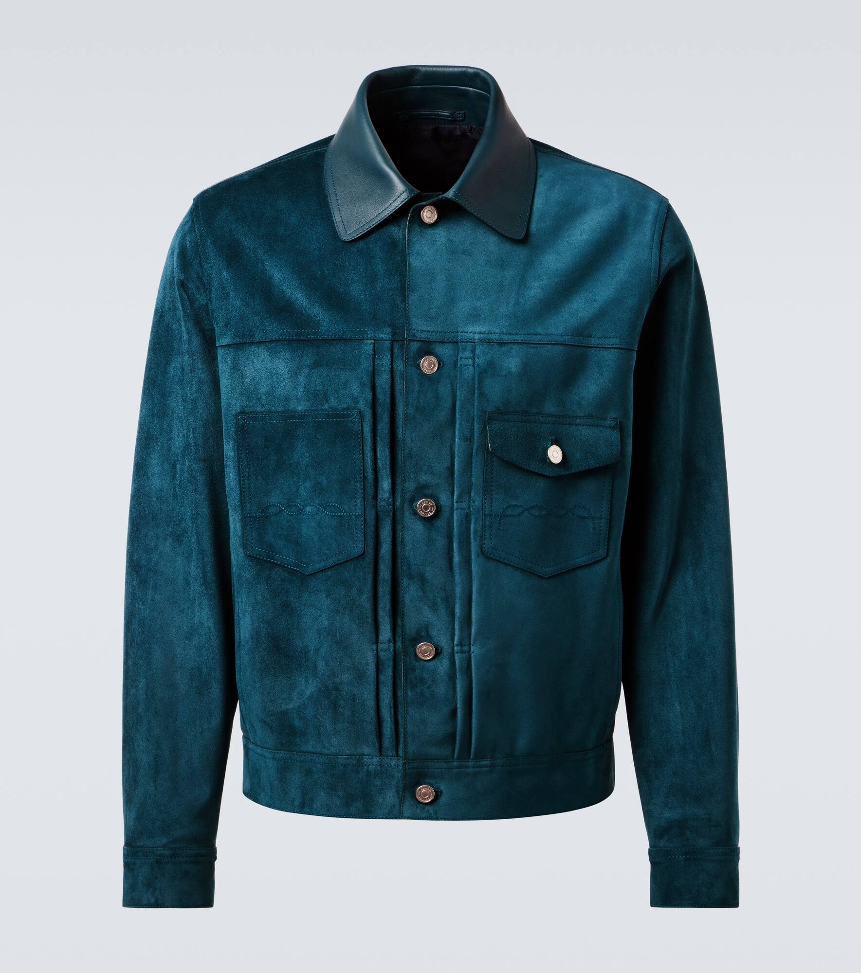 Product Details - Material: 100% calf leather (suede) - Care instructions: specialist clean - Made in Italy - Designer color name: Dark Teal Blue - Includes: garment bag - Closure: buttoned front - Lining: 100% cupro - Pockets: internal pockets, breast pockets - Item number: P00995545 Size & Fit - True to size - Slim fit - Non-stretchy fabric - Falls to the hip - The model in the picture is 185cm-6'1" and wearing a size IT 50