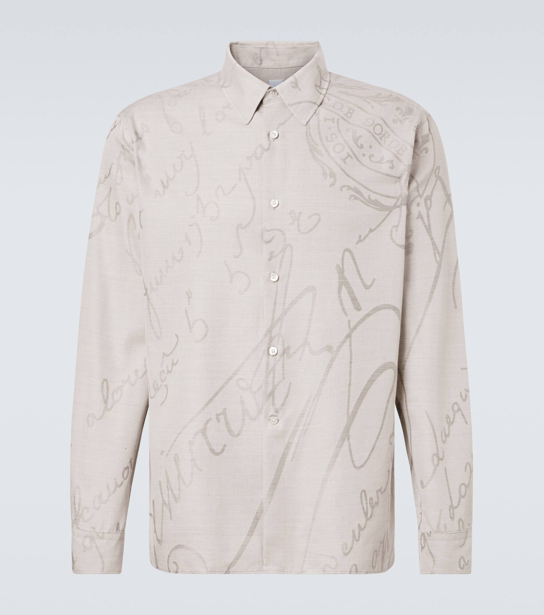 Build your wardrobe with elevated iterations, like this long-sleeve shirt by Berluti, crafted from cotton, wool, and silk. This style features the elegant Scritto motif, created by Olga Berluti as an homage to the art of calligraphy. Product Details - Material: 52% cotton, 24% wool, 24% silk - Care instructions: dry clean - Made in Italy - Designer color name: Beige - Item color: beige - Collar: classic (Straight point) - Closure: buttoned front - Cuff: buttoned - Item number: P01067258 Size & Fit - True to size - Without pleats in the back - Classic fit - Non-stretchy fabric - Falls to the hip - The model in the picture is 185cm-6'1" and wearing a size EU 41