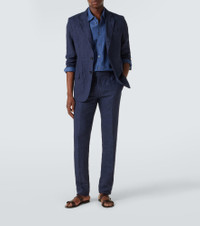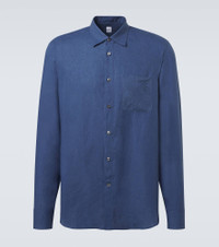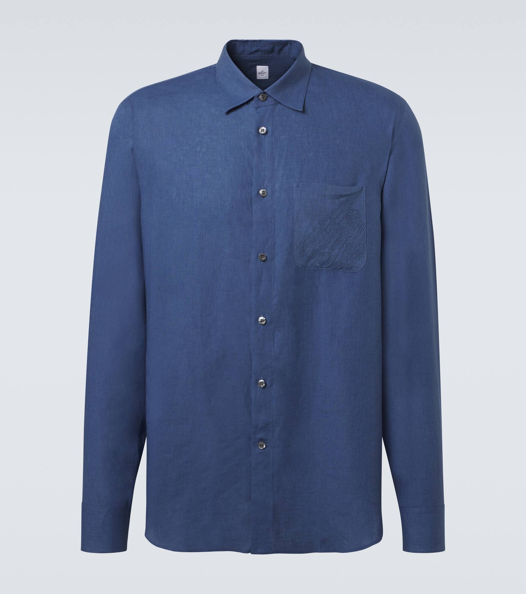 Berluti's lightweight linen shirt features a row of Mother-of-pearl buttons down the front. This piece features the extremely elegant Scritto motif, created by Olga Berluti as an homage to the art of calligraphy. Product Details - Material: 100% linen - Care instructions: dry clean - Made in Italy - Designer color name: Chambray Blue - Item color: blue - Closure: buttoned front - Pockets: breast pocket - Buttoned cuffs - Item number: P00995537 Size & Fit - True to size - Without pleats in the back - Classic fit - Non-stretchy fabric - Falls below the hip - Height of model is 189cm-74.5" and wears a size EU 41
