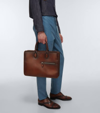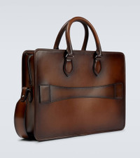 This Berluti briefcase is made in Italy from brown leather. It features two top handles and a detachable shoulder strap. Product Details - Internal details: internal zipped pocket, fabric lining, internal slot pockets - Color of fastening: antique silver - Made in Italy - Designer color name: Cacao Intenso - Zipped front pocket - Closure: two-way zipped top - Detachable, adjustable shoulder strap, Top handles - Material: leather - Item number: P00643019 Size & Fit - Height 27cm-10.5" - Width 38cm-15" - Depth 6cm-2.5" - Length of handles 35cm-14" - Min. length shoulder strap 124cm-49" - Max. length shoulder strap 148cm-58.5"