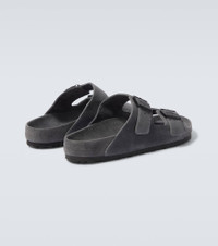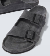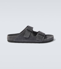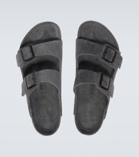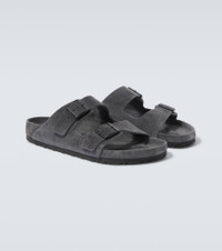 Crafted in Germany from suede, Birkenstock's Arizona sandals add a touch of innovation to the brand's classic design with a monochromatic look. This pair is shaped with two buckle straps and a soft texture. Product Details - Upper: calf leather (suede) - Lining: leather - Sole: leather insole, rubber sole - Toe shape: round open toe - Made in Germany - Includes: shoe box - Designer color name: Charcoal - Item color: gray - Closure: buckle fastening - Item number: P00990875 Size & Fit - True to size - Half sizes please take the next size down - European sizes - Birkenstock width: normal feet