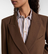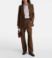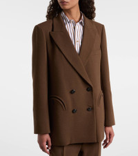 Foregrounding premium quality and timeless design, Blaze Milano pays tribute to a perennial fashion favorite: the blazer. Crafted from virgin wool, the Everynight blazer is tailored to a double-breasted silhouette and features the curved "Smiley" pockets on the hips. Product Details - Material: 100% virgin wool - Care instructions: dry clean - Made in Italy - Designer color name: Chocolate - Item color: brown - Lining: 100% viscose - Sleeve lining: 60% acetate, 40% viscose - Peak lapel - Closure: double-breasted (four buttons) - Pockets: internal pockets, angled chest pocket, buttoned pockets - Vent: double - Includes: garment bag - Item number: P01086251 Size & Fit - True to size - For a closer fit, we recommend taking one size down - Shoulder pad inserts - Oversized - Non-stretchy fabric - Falls below the hip - The model seen in the picture is 178cm-5'10" and wearing a size 1
