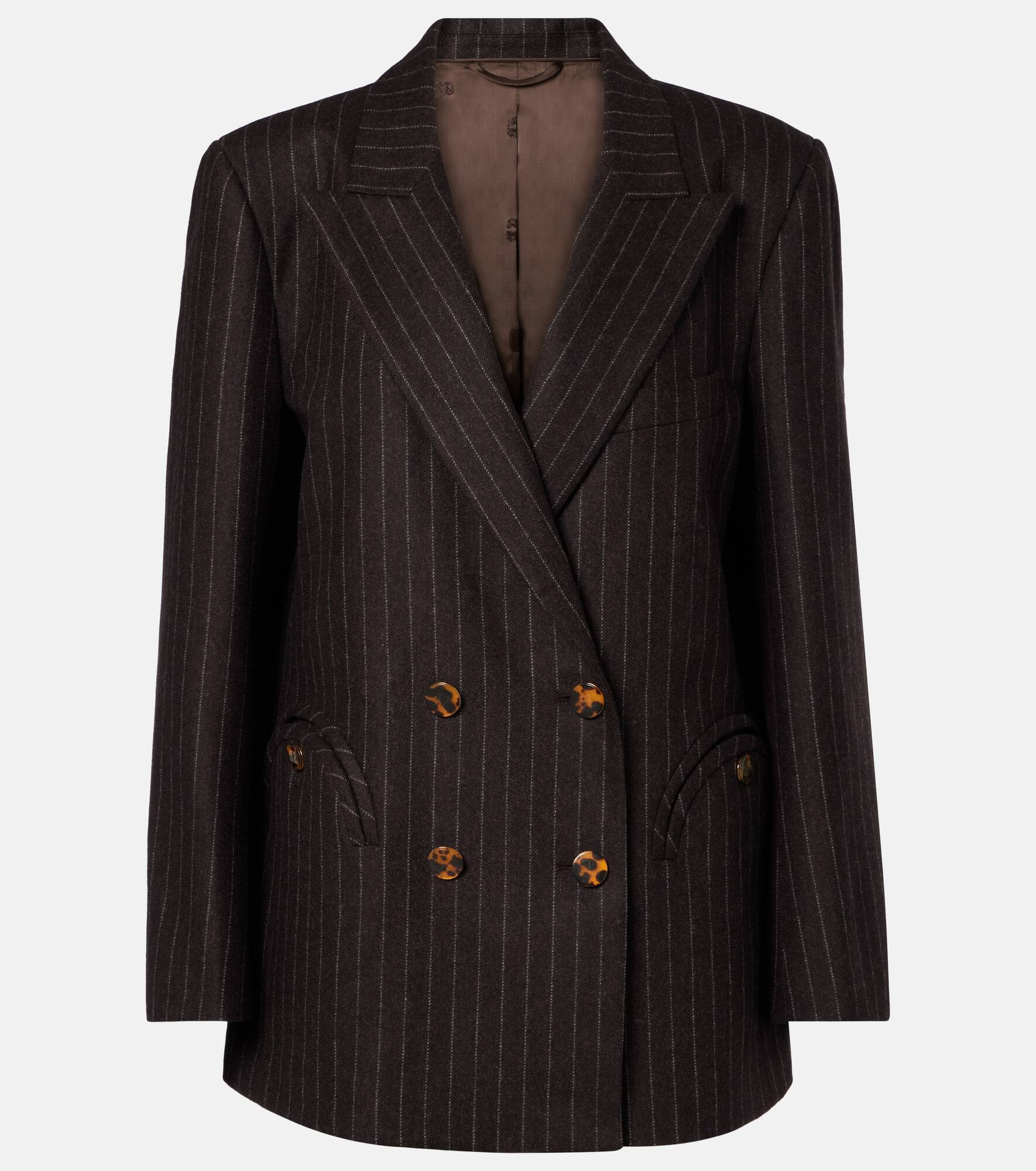 Foregrounding premium quality and timeless design, Blaze Milano pays tribute to a perennial fashion favorite: the blazer. The Everynight design is Italian-crafted from wool and cashmere with all-over pinstripes and signature curved pockets. Product Details - Material: 92% wool, 8% cashmere - Care instructions: dry clean - Made in Italy - Designer color name: Choco - Item color: brown - Lining: 100% viscose - Sleeve lining: 60% acetate, 40% viscose - Closure: double-breasted (four buttons) - Peak lapel - Pockets: breast pocket, patch pockets, internal pockets - Shoulder pads - Cuff: four buttons - Vent: double - Fully lined - Item number: P01059406 Size & Fit - True to size - Shoulder pad inserts - Designed for a loose fit - Non-stretchy fabric - Falls below the hip - The model seen in the picture is 178cm-5'10" and wearing a size 1