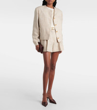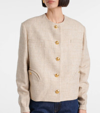Blaze Milano fuses traditionally feminine and masculine codes to create inspiring styles with an enduring appeal. Meticulously made from a linen, cotton, and silk blend, the buttoned Gliss jacket offers a bomber-like fit and is completed with lightly padded shoulders. Product Details - Material: 53% linen, 29% cotton, 13% silk, 5% polyamide - Care instructions: dry clean - Made in Italy - Designer color name: Sand - Item color: beige - Lining: 100% viscose - Sleeve lining: 100% viscose - Closure: button-down - Pockets: buttoned pockets - Item number: P01023354 Size & Fit - True to size - Shoulder pad inserts - Straight fit - Non-stretchy fabric - Falls to the hip - The model seen in the picture is 178cm-5'10" and wearing a size 1