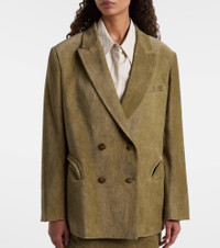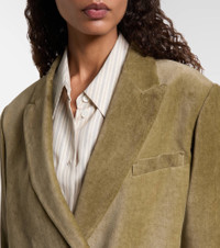 Foregrounding premium quality and timeless design, Blaze Milano pays tribute to a perennial fashion favorite: the blazer. Crafted in Italy from cotton velvet, the Nightbreak blazer features a double-breasted silhouette finished with signature "Smiley" pockets. Product Details - Material: 100% cotton - Care instructions: dry clean - Made in Italy - Designer color name: Frog - Item color: green - Lining: 100% viscose - Sleeve lining: 60% acetate, 40% viscose - Peak lapel - Closure: double-breasted (four buttons) - Pockets: internal pockets, angled chest pocket, buttoned pockets - Vent: single - Includes: garment bag - Item number: P01086250 Size & Fit - Fits large to size - we recommend trying one size smaller - Shoulder pad inserts - Designed for a loose fit - Non-stretchy fabric - Falls below the hip - The model seen in the picture is 178cm-5'10" and wearing a size 0