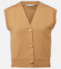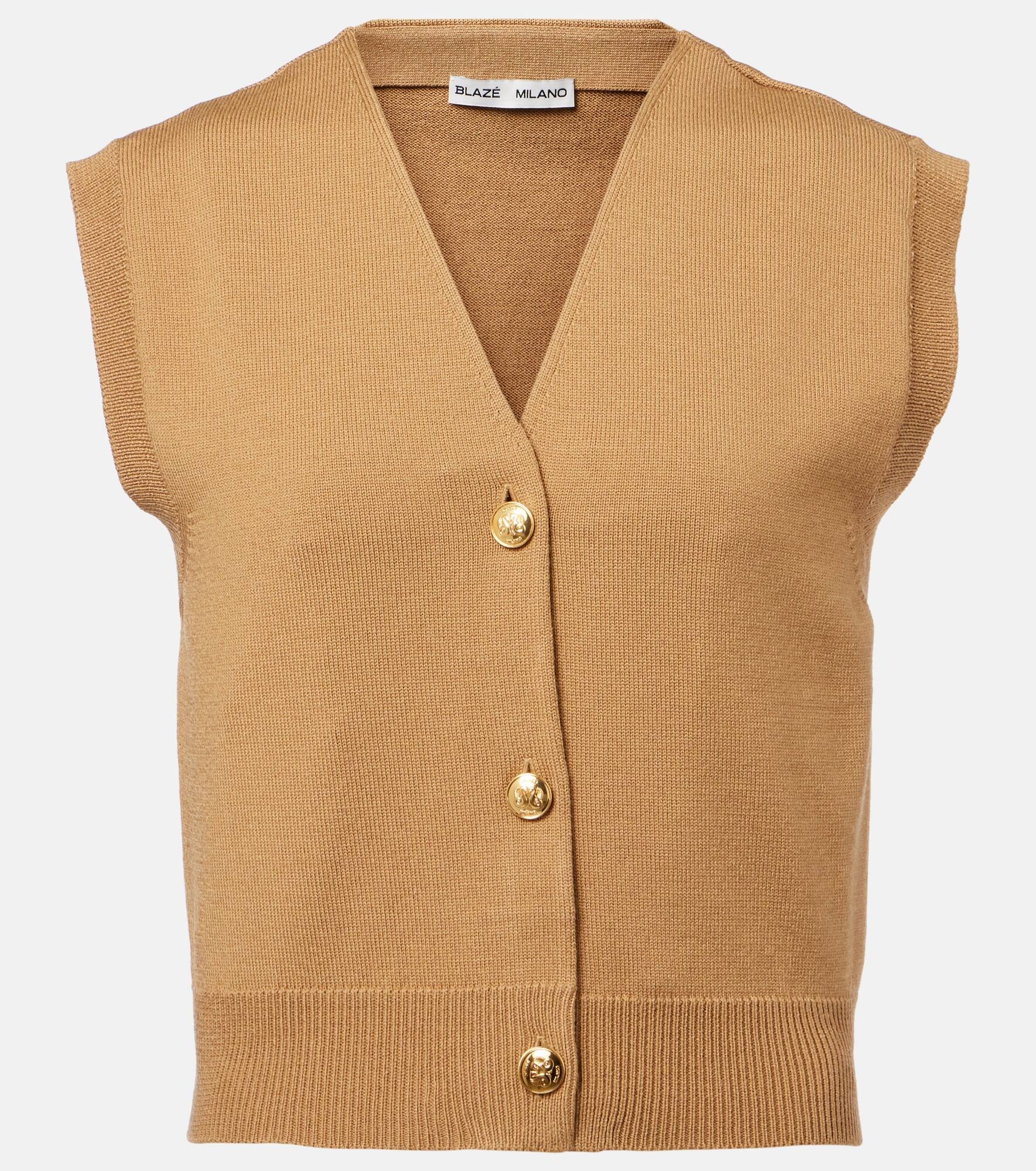 Blaze Milano fuses traditionally feminine and masculine codes to create inspiring styles with an enduring appeal. The Sebright sweater vest is made from wool-blend material with gold-toned buttons. Product Details - Material: 52% wool (merino wool), 48% polypropylene - Care instructions: dry clean - Made in Italy - Designer color name: Camel - Item color: brown - Closure: buttoned front - Item number: P01023385 Size & Fit - True to size - Straight fit - Slightly stretchy fabric - Cropped - The model seen in the picture is 178cm-5'10" and wearing a size 1