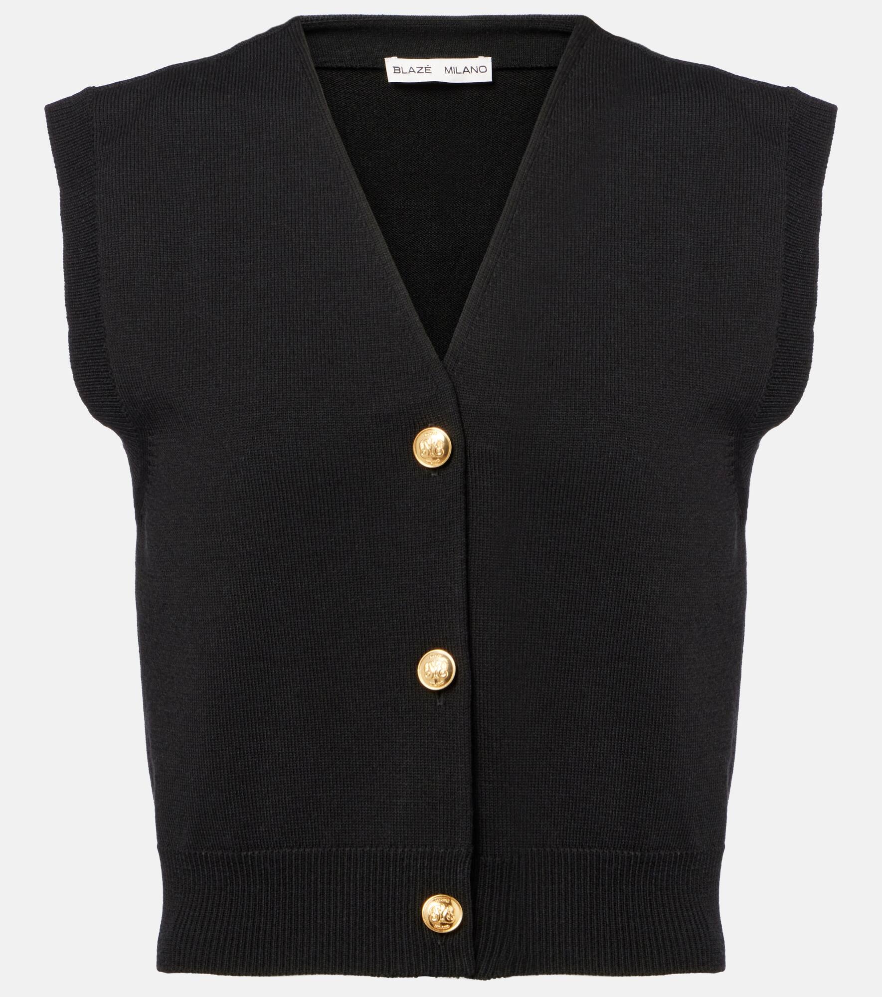 Blaze Milano fuses traditionally feminine and masculine codes to create inspiring styles with an enduring appeal. The Sebright sweater vest is made from wool-blend material with gold-toned buttons. Product Details - Material: 52% wool (merino wool), 48% polypropylene - Care instructions: hand wash - Made in Italy - Designer color name: Black - Item color: black - Closure: buttoned front - Item number: P01023387 Size & Fit - True to size - Straight fit - Slightly stretchy fabric - Cropped - The model seen in the picture is 178cm-5'10" and wearing a size 1