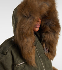 Channeling the glamour of the ’00s, Blumarine updates the Y2K aesthetic with this cotton-canvas jacket. Defined by shearling-trimmed hood and cuffs, this piece features a classic collar, practical pockets, and an elasticated waistband. Product Details - Material: 100% cotton - Care instructions: machine wash at 30 degrees - Made in Albania - Designer color name: Bark Green/Caramel - Item color: green, brown - Lining: 100% cotton - Filling: 100% polyester - Trim: 100% shearling - Lining II: 100% polyester - Contains non-textile parts of animal origin - Hardware color: silver - Collar: classic (Straight point) - Detachable cuffs - Closure: two-way zipped front - Hem: elasticated - Pockets: zipped pockets, slant pockets - Detachable hood - Item number: P01058527 Size & Fit - True to size - Dropped shoulders - Designed for a loose fit - Elasticated hem - Non-stretchy fabric - Falls to the hip - Height of model is 174cm-68.5" and wears a size IT 40