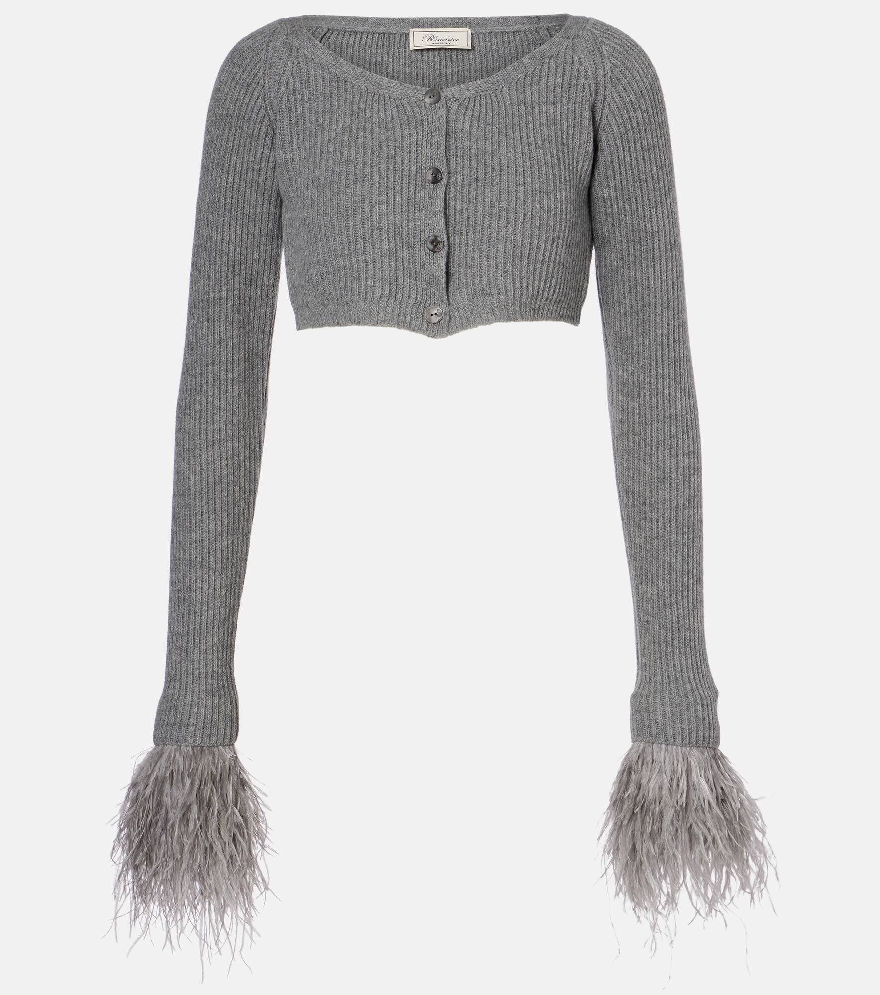 Blumarine captures the opulence of the '00s, contemporizing its aesthetic for a modern audience. This cropped wool cardigan features a ribbed-knit texture, button-front closure, round neckline, and statement feather-trimmed cuffs. Product Details - Material: 100% wool - Care instructions: dry clean - Made in Italy - Designer color name: Grey Excalibur - Item color: gray - Closure: buttoned front - Item number: P01058543 Size & Fit - True to size - Fitted - Stretchy fabric - Cropped - The model seen in the picture is 178cm-5'10" and wearing a size XS