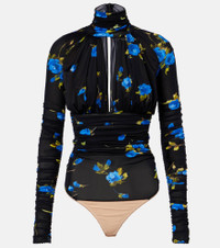 This jersey bodysuit from Blumarine is defined by its romantic floral print, high neckline, and sculptural ruched detailing along the bodice and sleeves. Featuring cutouts at the front and back, this piece is designed for a body-hugging fit. Product Details - Material: 90% polyamide, 10% elastane - Care instructions: machine wash at 30 degrees - Made in Italy - Designer color name: Black/Brilliant/Blue - Item color: black, blue, green - Material II: 75% polyamide, 25% elastane - Trim: 82% polyamide, 18% elastane - Lining: 75% polyamide, 25% elastane - Collar: turtleneck - Closure: zipped back, hook fastening - Item number: P01058511 Size & Fit - True to size - Fitted - Stretchy fabric - Medium-cut leg - The model seen in the picture is 178cm-5'10" and wearing a size IT 40