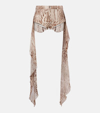These leopard-print cotton shorts from Blumarine make a bold statement with their micro-silhouette and georgette ruffles cascading down the back. Finished with the brand's "B" logo and five-pocket design, they offering a daring, fashion-forward look. Product Details - Material: 98% cotton, 2% elastane - Care instructions: machine wash at 30 degrees - Made in Albania - Designer color name: Chalk/Bear Brown - Item color: brown - Closure: zip and button fastening - Pockets: side slit pockets - Material II: 100% viscose - Item number: P01038728 Size & Fit - True to size - Non-stretchy fabric - Mid-rise - Medium-cut leg - The model seen in the picture is 178cm-5'10" and wearing a size IT 40