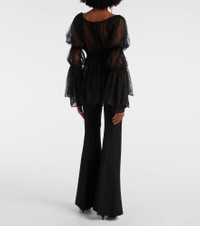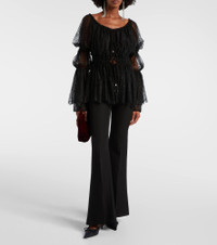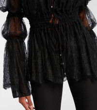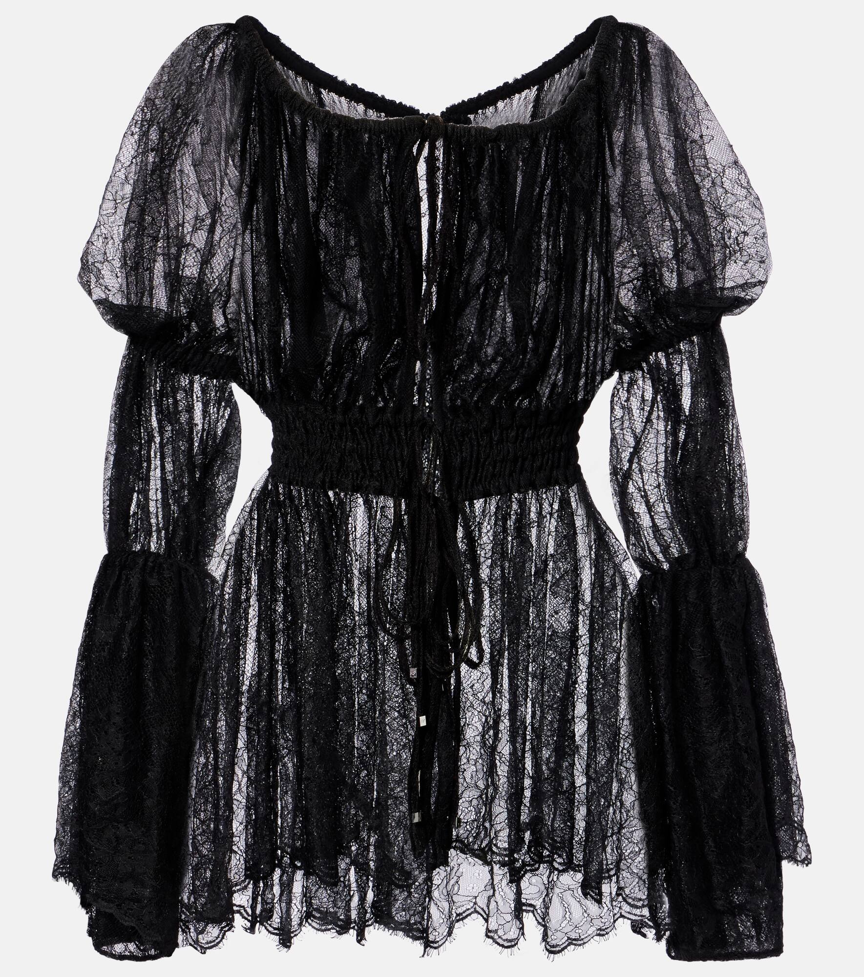 This long-sleeved top from Blumarine is crafted from semi-sheer floral Chantilly lace, featuring delicate front self-ties and an elasticated waistband. Designed for a relaxed fit, it offers effortless elegance. Product Details - Material: 50% polyamide, 50% viscose - Care instructions: dry clean - Made in Italy - Designer color name: Black - Item color: black - Lining: 100% polyamide - Lining II: 100% polyester - Contains non-textile parts of animal origin - Hardware color: silver - Closure: self-ties - Elasticated waistband - Item number: P01067679 Size & Fit - True to size - Semi-sheer - Loose fit, elasticated waist - Non-stretchy fabric - Falls below the hip - The model seen in the picture is 178cm-5'10" and wearing a size IT 40