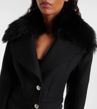 Blumarine captures the opulence of the '00s, contemporizing the Y2K aesthetic for a modern audience. This cropped, wool-blend jacket has a corset-inspired silhouette and is finished with a fur collar. Product Details - Material: 70% wool, 30% polyamide - Care instructions: dry clean - Made in Italy - Designer color name: Black - Item color: black - Lining: 57% viscose, 43% polyester - Trim: 100% shearling - Lining II: 100% polyester - Filling: 100% polyester - Contains non-textile parts of animal origin - Hardware color: silver - Notched lapel - Closure: buttoned front - Cuff: one button - Pockets: side slit pockets - Detachable collar - Item number: P01067682 Size & Fit - Fits large to size - we recommend trying one size smaller - Shoulder pad inserts - Straight fit - Non-stretchy fabric - Cropped - The model seen in the picture is 178cm-5'10" and wearing a size IT 38